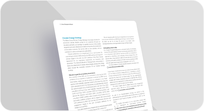 C _ Group Management Report Climate Change Strategy We are engaging with oil and gas companies to encourage them The Allianz Group Climate Change Strategy encourages solutions for to set net-zero emissions by 2050 targets for Scope 1 and 2 emissions. tomorrow’s climate. Besides caring for our customers through our By 2025, we aim for at least 50 percent of our assets under insurance products, we leverage our position as one of the world’s management in the oil and gas sector to have set these targets. largest insurers and institutional investors to help drive the transition to a low-carbon economy. We do this with our own activities, and we Anticipating climate risks contribute to various public/private partnerships. Our Climate Change Strategy aims to anticipate the risks of a changing Climate protection is an integral part of our core business. By climate. We systematically consider climate and sustainability criteria committing to net-zero GHG emissions by 2050, we have set long-term in our insurance and investment business. In 2021, we reviewed our climate targets in line with the 1.5°C ambition of the Paris Climate approach to identifying and managing climate change risks and Agreement for our proprietary investments, our insurance, and opportunities. Using internal models and external tools, we perform operations. The Allianz SE Board of Management’s remuneration is sensitivity and scenario analyses with time horizons extending to 2050, tied to the attainment of climate-related targets, among other things, and with global warming scenarios ranging from 1.5°C to 4°C. which include the successful execution of our Climate Change For more details on climate scenario analyses, see section 04.4 Strategy. . www.allianz.com/sustainability Climate targets for proprietary investments In pursuing our investment business, we consider climate-related criteria As a member of the AOA, we are committed to reducing the GHG such as carbon emissions, energy efficiency, vulnerability to climate emissions of our proprietary investments to net-zero by 2050. As an change, and opportunities in clean tech as part of our ESG integration intermediary target, we aim to reduce our emissions in our listed approach for listed and non-listed assets. We also systematically equities and tradeable corporate bonds by 25 percent by year-end engage with investee companies exposed to high ESG risks, offering 2024 compared to 2019. For this purpose, we systematically measure advice and encouraging them to define and pursue their own climate the carbon footprint of our listed equity (2021: 2.261 mn t CO₂e; 2020: strategies in line with the latest scientific findings. unaudited 2.192 mn t CO₂e) and tradeable corporate bonds (2021: For further insights into the Allianz Group´s ESG engagement 16.431 approach, please refer to our Group Sustainability Report 2021, mn t CO₂e; 2020: unaudited 19.95² mn t CO₂e) portfolio, and disclose the absolute and relative (2021: unaudited -24.91%; 2020: section 02.2.1 www.allianz.com/sustainability. unaudited -15.4%)3 portfolio carbon footprint values. Furthermore, our real estate portfolio's emissions will be aligned with science-based As part of our decarbonization strategy, we commit to fully 1.5°C pathways by 2025. We have also set emissions reduction and withdrawing from coal-based business models across our proprietary engagement targets in line with 1.5-degree pathways for our investment and Property-Casualty portfolios by 2040 at the infrastructure portfolio. latest. For further details on our targets and our carbon footprint, please For further information on our coal policy, please refer refer to our Group Sustainability Report 2021, section 05.7. to our “Statement on Coal-Based Business Models” To complement our portfolio climate targets for investments, we https://www.allianz.com/content/dam/onemarketing/azcom/Allia have set targets for two of the highest-emitting industries as well, nz_com/responsibility/documents/Allianz-Statement-coal-based- namely utilities, and oil and gas. business-models.pdf For more information on our current state of progress, please see Utilities section 02.2.1 of our Group Sustainability Report 2021 Complementing our coal phase-out commitment by gradually www.allianz.com/sustainability. increasing our investments in renewables and following at least the necessary annual growth rate of 5.85% as proposed by the Caring for the climate-vulnerable International Renewable Energy Agency (IRENA) as a minimum. We support our customers to reduce climate-related risks and minimize damage, compensating those who have suffered losses and Oil and gas insuring low-carbon developments. We prioritize collaboration with Supporting the commitment set out by the industry-led Oil & Gas our peers, governments and civil society to manage climate risks and Climate Initiative (OGCI) to limit the emission intensity for Scope 1 to “close the protection gap” in the most vulnerable parts of society. and 2 emissions of oil and gas companies in their exploration and We are piloting new approaches that combine insurance production business (“upstream”) to less than 20kg CO₂e per barrel of offerings with resilience-strengthening measures. For instance, oil, and aligning our oil and gas exposure on average-listed equity and approaches to incentivizing risk reduction include dedicated training corporate bonds portfolio to this intensity level. and advice as well as risk-differentiated premium structures. Key initiatives include the InsuResilience Global Partnership, Insurance Development Forum (IDF), the Munich Climate Insurance Initiative (MCII) and the Geneva Association Global Partnership. Since 2018, we 1_2021 carbon footprint figures impacted by COVID-19 and strong equity market performance; normalization expected in 2022. 2_Figures have been restated due to a change in methodology. 3_Figures have been restated due to a change in methodology, resul