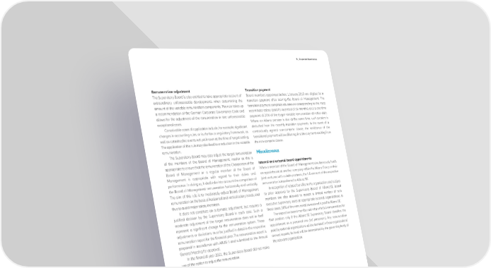 B _ Corporate Governance Remuneration adjustment Transition payment The Supervisory Board is also entitled to take appropriate account of Board members appointed before 1 January 2010 are eligible for a extraordinary unforeseeable developments when determining the transition payment after leaving the Board of Management. The amount of the variable remuneration components. This rule takes up transition payment comprises an amount corresponding to the most a recommendation of the German Corporate Governance Code and recent base salary (paid for a period of six months), plus a one-time allows for the adjustment of the remuneration in rare unforeseeable payment of 25 % of the target variable remuneration at notice date. exceptional cases. Where an Allianz pension is due at the same time, such pension is Conceivable cases of application include, for example, significant deducted from the monthly transition payments. In the event of a changes in accounting rules, or in the tax or regulatory framework, as contractually agreed non-compete clause, the remittance of the well as catastrophic events not yet known at the time of target setting. transitional payment will be offset against the payment resulting from The application of this rule may also lead to a reduction in the variable the non-compete clause. remuneration. The Supervisory Board may also adjust the target remuneration Miscellaneous of the members of the Board of Management, insofar as this is appropriate to ensure that the remuneration of the Chairperson of the Internal and external board appointments Board of Management or a regular member of the Board of When a member of the Board of Management simultaneously holds Management is appropriate with regard to their duties and an appointment at another company within the Allianz Group or their performance. In doing so, it shall take into account the comparison of joint ventures with outside partners, the full amount of the respective the Board of Management remuneration horizontally and vertically. remuneration is transferred to Allianz SE. The aim of this rule is to moderately adjust Board of Management In recognition of related benefits to the organization, and subject remuneration on the basis of horizontal and vertical salary trends, and to prior approval by the Supervisory Board of Allianz SE, board thus to avoid major salary increases. members are also allowed to accept a limited number of non- It does not constitute an automatic adjustment, but requires a executive supervisory roles at appropriate external organizations. In justified decision by the Supervisory Board in each case. Such a these cases, 50 % of the remuneration received is paid to Allianz SE. moderate adjustment of the target remuneration does not in itself The respective board member will retain the full remuneration for represent a significant change to the remuneration system. These that position only if the Allianz SE Supervisory Board classifies the adjustments or deviations must be justified in detail in the respective appointment as a personal one (ad personam). Any remuneration remuneration report for the financial year. The remuneration report is paid by external organizations will be itemized in those organizations’ prepared in accordance with ARUG II and submitted to the Annual annual reports; its level will be determined by the governing body of General Meeting for approval. the relevant organization. In the financial year 2021, the Supervisory Board did not make use of the option to adjust the remuneration. Termination of service Board of Management contracts are limited to a period of five years. For new appointments, a shorter period of up to three years is provided based on the recommendation by the German Corporate Governance Code. Severance payment cap Payments for early termination to board members with a remaining term of contract of more than two years are capped at twice the annual compensation, consisting of the last financial year’s base salary and 100 % of the variable target compensation. If the remaining term of contract is less than two years, the payment is pro-rated for the remaining term of the contract. Contracts do not contain provisions for any other cases of early termination of Board of Management service. In the event of a contractually agreed non-compete clause, a severance payment is offset against compensation resulting from the non-compete clause in case of premature termination of service. Annual Report 2021 − Allianz Group 31
