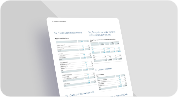 D _ Consolidated Financial Statements 24 _ Fee and commission income 26 _ Change in reserves for insurance and investment contracts (net) Fee and commission income € mn 2021 2020 Change in reserves for insurance and investment contracts (net) € mn PROPERTY-CASUALTY Property- Consoli- Fees from credit and assistance business 1,532 1,225 Casualty Life/Health dation Group Service agreements 467 415 2021 Subtotal 1,998 1,640 Gross (418) (13,355) 30 (13,743) LIFE/HEALTH Ceded (10) 23 14 27 Investment advisory 1,622 1,345 Net (428) (13,332) 44 (13,716) Service agreements 191 155 2020 Subtotal 1,813 1,500 Gross (320) (12,965) 30 (13,255) ASSET MANAGEMENT Ceded 12 281 (13) 279 Management and advisory fees 9,566 8,336 Net (308) (12,684) 17 (12,976) Loading and exit fees 370 389 Performance fees 633 402 Other 33 63 Subtotal 10,602 9,190 27 _ Interest expenses CORPORATE AND OTHER Service agreements 2,219 2,001 Investment advisory and banking activities 666 670 Interest expenses Subtotal 2,886 2,671 € mn 2021 2020 CONSOLIDATION (3,301) (2,953) Liabilities to banks and customers (99) (83) Total 13,998 12,049 Deposits retained for reinsurance ceded (340) (88) Certificated liabilities (162) (159) Subordinated liabilities (455) (565) Other (103) (104) Total (1,159) (999) 25 _ Claims and insurance benefits incurred (net) Claims and insurance benefits incurred (net) 28 _ Impairments of investments (net) € mn Property- Consoli- Casualty Life/Health dation Group Impairments of investments (net) € mn 2021 2021 2020 Gross (40,302) (22,697) 73 (62,926) Impairments Ceded 4,737 1,140 (73) 5,804 Available-for-sale investments Net (35,565) (21,557) - (57,121) Equity securities (1,077) (4,549) 2020 Debt securities (315) (493) Gross (40,066) (21,799) 46 (61,818) Subtotal (1,391) (5,041) Ceded 4,183 591 (46) 4,728 Other (139) (439) Net (35,883) (21,208) - (57,091) Subtotal (1,530) (5,481) Reversals of impairments 199 14 Total (1,331) (5,467) 162 Annual Report 2021 − Allianz Group