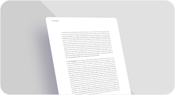 A _ To Our Investors In addition, the committee dealt extensively with the compliance system and the internal auditing system, as well as the accounting process and internal financial reporting control mechanisms. At several meetings, the Audit Committee discussed with the Board of Management the effects of the changeover to the new accounting standards IFRS 9 & 17 with its respective effects on Allianz’s accounting from financial year 2023 onwards and the status of the implementation measures for a proper transition to the new standards. At all regular meetings, reports on legal and compliance issues in the Group, operational risks and the work of the Internal Audit department were presented and discussed in detail. Furthermore, the head of the actuarial function (Group Actuarial, Planning & Controlling) presented his annual report. In addition, the Audit Committee discussed the adjustments resulting from the Financial Market Integrity Strengthening Act (FISG), and the internal audit plan for 2022. The Audit Committee held in-depth discussions with the Board of Management on the progress of the civil as well as the administrative proceedings of the U.S. Securities and Exchange Commission (SEC) and the U.S. Department of Justice in the matter of the Structured Alpha Funds of AllianzGI U.S. A separate working group of the Audit Committee was additionally set up for this purpose; this group held four meetings in the reporting year, which were also attended by the lawyers engaged by the Supervisory Board. The Risk Committee held two meetings in 2021. At both meetings, the committee discussed the current risk situation of the Allianz Group and Allianz SE with the Board of Management. In the March meeting, the risk report and other risk-related statements in the annual Allianz SE and consolidated financial statements as well as management and group management reports were reviewed with the auditor and approved. The appropriateness of the early risk recognition system at Allianz SE and Allianz Group and the result of further risk assessments by the auditor were also discussed. The Audit Committee was recommended to include the Risk Report, as presented and discussed, in the Annual Report. At both meetings, the Risk Committee examined the risk strategy in detail, including risk appetite, capital management and the external rating as well as the effectiveness of the risk management system for the Allianz Group and Allianz SE. The committee further looked in detail at the report on Allianz’s own risk and solvency assessment and the changes to the internal Solvency II model, and held discussions with the Board of Management, in particular about transactions with portfolios in the life insurance sector to improve the return on equity and the solvency position. The Risk Committee also focused on the topic of inflation risk and, in this context, Allianz’s exposure in the event of rising inflation rates and the consideration of inflation trends in pricing, as well as on the developments relating to “silent cyber”, i.e., the unintended, implied coverage of cyber risks, especially in the area of commercial insurance. In addition, the consequences of the COVID-19 pandemic were again addressed with regard to the business development and risk situation, the management of reputational risks and accumulation risks as well as the management of non- financial risks. The Risk Committee also dealt extensively with the impact of the AllianzGI Structured Alpha matter on the risk situation at Allianz. In addition, special regulatory topics, such as the EIOPA review of Solvency II, as well as business policy topics were also on the agenda. The Technology Committee held two meetings in the financial year 2021, at which it discussed in detail the reorganization of information technology in the Allianz Group, the IT strategy and, in particular, the strategic IT partners in cloud and IT applications, and in the comprehensive IT transformation. The focus was again on the implementation of the Business Master Platform (BMP) in the context of the Allianz Customer Model (ACM). Another focus of the committee’s activities was dealing with the ever-growing cyber risks and the resulting increase in IT security requirements, as well as Allianz’s use of disruptive technology innovations, e.g., the Internet of Things and Digital Twins. 8 Annual Report 2021 − Allianz Group