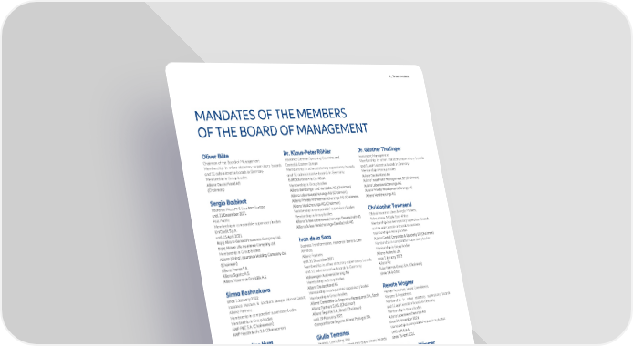 A _ To our Investors MANDATES OF THE MEMBERS OF THE BOARD OF MANAGEMENT Chairman of the Board of Management Insurance German Speaking Countries and Investment Management Membership in other statutory supervisory boards Central & Eastern Europe Membership in other statutory supervisory boards and SE administrative boards in Germany Membership in other statutory supervisory boards and SE administrative boards in Germany Membership in Group bodies and SE administrative boards in Germany Membership in Group bodies Membership in Group bodies Insurance Western & Southern Europe Membership in comparable1 supervisory bodies Asia Pacific Membership in Group bodies 1 Membership in comparable supervisory bodies Global Insurance Lines & Anglo Markets, Reinsurance, Middle East, Africa Membership in other statutory supervisory boards and SE administrative boards in Germany Membership in Group bodies Membership in Group bodies Business Transformation, Insurance Iberia & Latin 1 America, Membership in comparable supervisory bodies Allianz Partners Membership in Group bodies Membership in other statutory supervisory boards and SE administrative boards in Germany Membership in Group bodies 1 Insurance Western & Southern Europe, Allianz Direct, Membership in comparable supervisory bodies Allianz Partners Membership in Group bodies Human Resources, Legal, Compliance, 1 Membership in comparable supervisory bodies Mergers & Acquisitions Membership in Group bodies Membership in other statutory supervisory boards and SE administrative boards in Germany Membership in Group bodies 1 Membership in comparable supervisory bodies Asset Management, US Life Insurance Finance, Controlling, Risk 1 Membership in other statutory supervisory boards Membership in comparable supervisory bodies and SE administrative boards in Germany Membership in Group bodies Membership in Group bodies Asset Management, US Life Insurance Membership in other statutory supervisory boards Operations and IT and SE administrative boards in Germany Membership in other statutory supervisory boards Membership in Group bodies and SE administrative boards in Germany Membership in Group bodies 1 Membership in comparable supervisory bodies Membership in Group bodies 1 Membership in comparable supervisory bodies Membership in Group bodies 1_Generally, we regard memberships in other supervisory bodies as comparable if the company is listed on a stock exchange or has more than 500 employees. Annual Report 2021 − Allianz Group 13