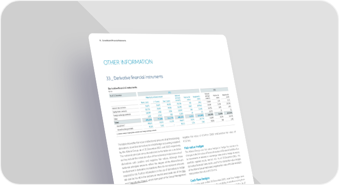 D _ Consolidated Financial Statements OTHER INFORMATION 33 _ Derivative financial instruments Derivative financial instruments € mn As of 31 December 2021 2020 Maturity by notional amount Notional Notional principal Positive fair Negative fair principal Positive fair Negative fair Up to 1 year 1 - 5 years Over 5 years amounts values values amounts values values Interest rate contracts 34,675 26,647 89,378 150,700 928 (266) 138,013 1,541 (117) Equity/index contracts 327,733 20,604 19,558 367,895 9,969 (19,964) 333,707 13,530 (23,733) Foreign exchange contracts 130,949 2,482 2,016 135,447 560 (1,646) 116,701 1,493 (471) Other 2,287 27,947 826 31,060 64 (9) 26,479 34 (2) Total 495,644 77,680 111,778 685,102 11,521 (21,885) 614,900 16,598 (24,323) thereof OTC1 400,621 74,578 111,778 586,977 10,245 (21,779) 524,572 15,738 (24,223) thereof exchange-traded 95,023 3,102 - 98,125 1,276 (106) 90,328 860 (100) 1_Consists mainly of equity/index contracts and foreign exchange contracts. The table shows the fair value and notional amounts of all freestanding negative fair value of € 0.4 bn (2020: total positive fair value of derivatives, as well as derivatives for which hedge accounting is applied € 0.2 bn). by the Allianz Group, as of 31 December 2021 and 2020 respectively. The notional principal amounts indicated in the table are cumulative, Fair value hedges as they include the absolute value of the notional principal amounts of The Allianz Group uses fair value hedges to hedge the exposure to derivatives with positive and negative fair values. Although these changes in the fair value of financial assets and financial liabilities due notional principal amounts reflect the degree of the Allianz Group’s to movements in interest or exchange rates and to hedge its equity involvement in derivative transactions, they do not represent amounts portfolio against equity market risk. As of 31 December 2021, the exposed to risk. Further information on the use of derivatives to hedge derivative financial instruments used for the related fair value hedges risk can be found in the sections on market and credit risk of the Risk of the Allianz Group had a total negative fair value of € 256 mn (2020: and Opportunity Report, which forms part of the Group Management total positive fair value of € 58 mn). Report. Cash flow hedges During the year ended 31 December 2021, cash flow hedges were As of 31 December 2021, freestanding derivatives, which are included used to hedge the exposure to the variability of cash flows arising from in the line item financial assets and liabilities held for trading, had a interest rate or exchange rate fluctuations as well as inflation. As of notional principal amount of € 658.1 bn (2020: € 586.9 bn) as well as 31 December 2021, the derivative instruments utilized had a total a positive fair value of € 11.2 bn (2020: € 15.5 bn), and a negative fair negative fair value of € 40 mn (2020: total positive fair value of value of € 20.9 bn (2020: € 24.1 bn). Out of the total allocated to € 620 mn). the freestanding derivatives, € 122.2 bn (2020: € 111.6 bn) of the The ineffectiveness that arises from cash flow hedges is immaterial. notional principal relate to annuity products. Annuity products are equity-indexed or contain certain embedded options or guarantees Hedges of net investment in foreign operations which are considered embedded derivatives under IAS 39. For these As of 31 December 2021, the Allianz Group hedged part of its foreign embedded derivatives, the notional principal amounts included in the currency net investments through the issuance of several foreign table refer to the account value of the related insurance contracts. The currency denominated liabilities and the use of forward sales. The total total negative fair value of these embedded derivatives amounts to negative fair value in 2021 was € 367 mn (2020: total positive fair € 12.9 bn (2020: € 12.4 bn). Further information on the fair value value of € 212 mn). measurement of these derivatives can be found in note 34 . The Allianz Group enters into enforceable master netting arrangements and similar arrangements mainly for derivatives As of 31 December 2021, derivatives, which form part of hedge transactions. None of these enforceable master netting accounting relationships and which are included in the line items other arrangements or similar arrangements meet the requirements for assets and other liabilities, had a notional amount of € 27.0 bn (2020: offsetting in line with IAS 32. € 28.0 bn) as well as a positive fair value of € 0.3 bn (2020: € 1.1 bn) Credit risk associated with netting arrangements is further and a negative fair value of € 1.0 bn (2020: € 0.2 bn). These hedging mitigated by collateral. For further information on collateral, please instruments mainly include foreign exchange rate forwards with a total 166 Annual Report 2021 − Allianz Group