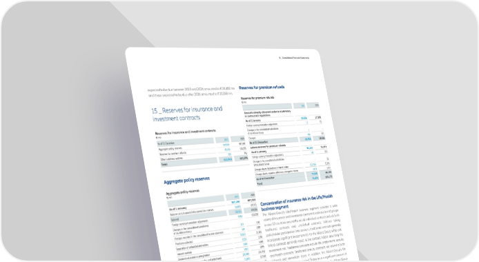 D _ Consolidated Financial Statements expected to be due between 2023 and 2026 amounted to € 24,482 mn and those expected to be due after 2026 amounted to € 20,338 mn. Reserves for premium refunds € mn 15 _ Reserves for insurance and 2021 2020 Amounts already allocated under local statutory investment contracts or contractual regulations As of 1 January 18,036 17,508 Foreign currency translation adjustments 13 (3) Reserves for insurance and investment contracts Changes in the consolidated subsidiaries € mn of the Allianz Group 1 - As of 31 December 2021 2020 Changes 406 531 Aggregate policy reserves 537,876 507,184 As of 31 December 18,456 18,036 Reserves for premium refunds 93,476 103,170 Latent reserves for premium refunds Other insurance reserves 709 741 As of 1 January 85,134 72,273 Total 632,061 611,096 Foreign currency translation adjustments 182 (52) Changes in the consolidated subsidiaries of the Allianz Group - (5) Changes due to fluctuations in market value (12,726) 11,381 Changes due to valuation differences charged to income 2,430 1,537 As of 31 December 75,020 85,134 Aggregate policy reserves Total 93,476 103,170 € mn 2021 2020 As of 1 January 507,184 497,558 Balance carry forward of discounted loss reserves (4,603) (4,552) Subtotal 502,581 493,006 Foreign currency translation adjustments 9,454 (10,220) The Allianz Group’s Life/Health business segment provides a wide Changes in the consolidated subsidiaries variety of insurance and investment contracts to individuals and groups of the Allianz Group 871 (38) Changes recorded in the consolidated income statement 749 1,587 in over 30 countries around the world. Individual contracts include both Premiums collected 30,567 31,181 traditional contracts and unit-linked contracts. Without taking Separation of embedded derivatives 2,031 1,356 policyholder participation into account, traditional contracts generally Interest credited 7,084 5,580 incorporate significant investment risk for the Allianz Group, while unit- Dividends allocated to policyholders 1,907 1,845 linked contracts generally result in the contract holder assuming the Releases upon death, surrender, and withdrawal (20,384) (21,192) investment risk. Traditional contracts include life, endowment, annuity, Policyholder charges (1,833) (1,760) and health contracts. Traditional annuity contracts are issued in both Portfolio acquisitions and disposals (801) 17 deferred and immediate types. In addition, the Allianz Group’s life Other changes1 842 1,219 insurance operations in the United States issue a significant amount of Subtotal 533,068 502,581 equity-indexed deferred annuities. In certain markets, the Allianz Group Ending balance of discounted loss reserves 4,808 4,603 also issues group life, group health, and group pension contracts. As of 31 December 537,876 507,184 As of 31 December 2021 and 2020, the Allianz Group’s reserves 1_Mainly relate to insurance contracts, when policyholders change their contract from an unit-linked to an universal life- for insurance and investment contracts for the business segment type contract. Life/Health are summarized per reportable segment as follows: Concentration of insurance risk in the Life/Health business segment per reportable segment € mn As of 31 December 2021 2020 Reserves for Financial Reserves for Financial insurance and liabilities for insurance and liabilities for investments unit-linked investments unit-linked contracts contracts Total contracts contracts Total German Speaking Countries and Central & Eastern Europe 367,549 16,785 384,334 359,708 11,802 371,510 Western & Southern Europe and Asia Pacific 121,182 118,652 239,834 127,173 104,404 231,577 Iberia & Latin America 7,620 2,044 9,665 8,047 1,500 9,546 USA 123,704 20,241 143,945 104,413 19,164 123,577 Global Insurance Lines & Anglo Markets, Middle East and Africa 2,428 624 3,052 2,585 437 3,021 Consolidation and Other (5,376) - (5,376) (5,850) 1 (5,849) Total 617,109 158,346 775,454 596,074 137,307 733,382 Annual Report 2021 − Allianz Group 155