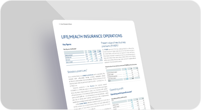 C _ Group Management Report LIFE/HEALTH INSURANCE OPERATIONS Present value of new business 5 Key figures Life/Health1,2,3 premiums (PVNBP) Our PVNBP grew by € 17,117 mn, totaling € 82,565 mn. Most of the 2021 2020 Delta increase was due to higher sales volumes for fixed index annuities in Statutory premiums2 € mn 78,348 74,044 4,304 the United States, and back-book management in Italy and France. Operating profit € mn 5,011 4,359 652 Other factors included increased volumes from unit-linked products in Net income € mn 4,170 3,766 404 Italy, and a large reinsurance treaty at Allianz Reinsurance. Positive Return on equity3 % 13.0 12.8 0.2 %-p effects were partly offset by lower sales volumes for capital-efficient products in the German life business. 4 Present value of new business premiums (PVNBP) by lines of business Statutory premiums % 2021 2020 Delta On a nominal basis, our statutory premiums went up by 5.8 %. This Guaranteed savings & annuities 12.2 13.6 (1.4) includes both unfavorable foreign currency translation effects Protection & health 20.8 17.4 3.3 (€ 766 mn) and positive (de-)consolidation effects (€ 48 mn). On an Unit-linked without guarantee 25.2 24.4 0.8 internal basis, statutory premiums grew by 6.8 % – or € 5,022 mn – to Capital-efficient products 41.9 44.6 (2.7) € 79,021 mn. Total 100.0 100.0 - Statutory premiums in the German life business totaled € 23,868 mn, a 9.0 % decrease on an internal basis that was largely driven by lower single premium sales in our business with capital- Operating profit efficient products. In the German health business, statutory premiums went up to € 3,895 mn – a 4.1 % increase on an internal basis – which was due to strong new business premiums in the comprehensive healthcare coverage as well as premium adjustments. In the United States, statutory premiums rose to € 13,214 mn, a Operating profit by profit sources 37.9 € mn % increase on an internal basis. Most of it was attributable to higher sales of fixed index annuity products as well as of non- 2021 2020 Delta traditional variable-annuity products. Loadings and fees 6,888 6,605 284 In Italy, statutory premiums grew to € 14,021 mn, or 12.3 % on an Investment margin 4,440 4,194 246 internal basis. This was predominantly due to stronger sales for unit- Expenses (7,999) (7,365) (635) linked without guarantee products. Technical margin 1,305 1,132 173 In France, statutory premiums increased to € 7,783 mn, a 5.1 % Impact of changes in DAC 377 (206) 583 rise on an internal basis. It was largely attributable to higher sales of Operating profit 5,011 4,359 652 hybrid products. In the Asia-Pacific region, statutory premiums went up to € 6,972 mn. Most of this rise – 15.7 % increase on an internal basis – was due to sales increases for unit-linked products in Indonesia, Taiwan Our operating profit increased strongly. Key drivers were higher sales and the Philippines. for non-traditional variable-annuity products with higher reserve loadings, an improved investment margin, and the previous year’s loss recognition in the United States. Other factors included increased unit-linked management fees in Italy, an improved investment margin in France, and a better technical margin for the German life and health business. The positive development was partly offset by a write-off for an administrative system in Benelux. Furthermore, higher acquisition costs were largely compensated by the capitalization of deferred acquisition costs. 1_For further information on Allianz Life/Health figures, please refer to note 4 to the Consolidated Financial 4_In this section, our comments in the following section on the development of statutory gross premiums Statements. written refer to values determined “on an internal basis”, i.e., adjusted for foreign currency translation 2_Statutory premiums are gross premiums written from sales of life and health insurance policies as well as and (de-) consolidation effects, in order to provide more comparable information. gross receipts from sales of unit-linked and other investment-oriented products, in accordance with the 5_PVNBP before non-controlling interests. statutory accounting practices applicable in the insurer’s home jurisdiction. 6_The purpose of the analysis of Life/Health operating profit sources is to explain movements in IFRS results 3_Represents the ratio of net income to the average total equity, excluding unrealized gains/losses on by analyzing underlying drivers of performance, consolidated for the Life/Health business segment. bonds, net of shadow accounting, at the beginning of the period and at the end of the period. 80 Annual Report 2021 − Allianz Group