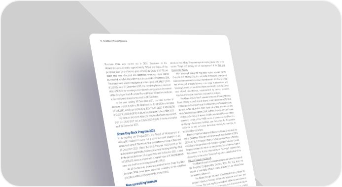 D _ Consolidated Financial Statements Purchase Plans was carried out in 2021. Employees of the details on how Allianz Group manages its capital, please refer to the Allianz Group purchased approximately 75 section “Target and strategy of risk management” of the % of the shares of the Risk and purchase plan at a reference price of € 197.82 (2020: € 167.76) per Opportunity Report. share and were allocated one additional share per three shares With Solvency II being the regulatory regime relevant for the purchased, which is equivalent to a discount of approximately 25 Group as of 1 January 2016, the risk profile is measured and steered %. The shares were sold to employees at a mean price of € 148.37 (2020: based on the approved Solvency II internal model1. The Allianz Group € 125.82). As of 31 December 2021, the remaining treasury shares of has introduced a target Solvency ratio range in accordance with Allianz SE held for covering subscriptions by employees in the context Solvency II, based on pre-defined stress scenarios for both the Group of the Employee Stock Purchase Plans of Allianz SE and its subsidiaries and related undertakings, supplemented by ad-hoc scenarios, in Germany and abroad amounted to 38,720 shares. historical and reverse stress tests, and sensitivity analyses. In the year ending 31 December 2021, the total number of The Allianz Group’s Own Funds are composed of the eligible Own treasury shares of Allianz SE decreased by 8,769 (2020: a decrease Funds relating to the Group of internal model and standard formula of 348,188), which corresponds to € 25,116.49 (2020: € 988,015.75) entities, the sectoral Own Funds of entities from other financial sectors, or 0.002 % (2020: 0.08 %) of issued capital as of 31 December 2021. as well as the equivalent Own Funds of entities included via the The treasury shares of Allianz SE and its subsidiaries represented deduction and aggregation (D&A) method. The eligible Own Funds € 0.7 mn (2020: € 0.7 mn) or 0.06 % (2020: 0.06 %) of the issued capital relating to the Group of internal model and standard formula entities as of 31 December 2021. essentially consist of the MVBS excess of assets over liabilities plus qualifying subordinated liabilities, less deductions for foreseeable dividends as well as further deductions relating, for example, to In its meeting on 5 August 2021, the Board of Management of transferability restrictions. Allianz SE resolved to carry out a share buy-back program in an Based on the information available to the Allianz Group as of the amount of up to € 750 mn within a period between August 2021 and end of December 2021 and with a Solvency II capitalization of 209 % 31 December 2021 (Share Buy-Back Program 2021) based on the (2020: 207 %), it is expected that the Group continues to be sufficiently authorization granted by the Annual General Meeting on 9 May 2018. capitalized and compliant with both the regulatory Solvency Capital In the period between 18 August 2021 and 22 October 2021, a total Requirement and the minimum consolidated Group Solvency Capital of 3,835,255 treasury shares with a market value of € 749,998,846.69 Requirement. For further information on Solvency II capitalization, were acquired for an average price of € 195.55. please refer to the section “Solvency II regulatory capitalization” of the All of the treasury shares acquired within the Share Buy-Back Risk and Opportunity Report. Program 2021 have been redeemed according to the simplified The Allianz Group is a financial conglomerate within the scope of procedure without reduction of the share capital. the Financial Conglomerates Directive (FCD). The FCD does not impose a materially different capital requirement on Allianz Group compared to Solvency II. The Allianz Group’s insurance subsidiaries (including Allianz SE) Non-controlling interests prepare individual financial statements based on local laws and € mn regulations. The local regulations establish additional restrictions on As of 31 December 2021 2020 the minimum level of capital and the amount of dividends that may be Unrealized gains and losses (net) 201 354 paid to shareholders. The respective local minimum capital Share of earnings 495 326 requirements are based on various criteria including, but not limited to, Other equity components 3,575 3,093 the volume of premiums written or claims paid, amount of insurance Total 4,270 3,773 reserves, investment risks, credit risks, and underwriting risks. As of 31 December 2021, the Allianz Group believes that there are no outstanding regulatory capital or compliance matters that would have material adverse effects on the financial position or the results of operations of the Allianz Group. For further information on the The Allianz Group’s capital requirements primarily depend on the type Structured Alpha matter please refer to note 37. of business that it underwrites, the industry and geographic locations Some insurance subsidiaries of the Allianz Group are subject to in which it operates, and the allocation of the Allianz Group’s regulatory restrictions on the amount of dividends that can be remitted investments. During the Allianz Group’s annual planning and strategic to Allianz SE without prior approval by the appropriate regulatory dialogs with its related undertakings, internal capital requirements are body. These restrictions require that a company may only pay determined through business plans regarding the levels and timing of dividends up to an amount in excess of certain regulatory capital capital expenditures and investments. These plans also form the basis levels, or based on the levels of undistributed earned surplus or current for the Allianz Group’s capital management. Resilience under stress year income or a percentage thereof. Allianz Group’s Board of conditions is also considered when determining the internal capital Management believes that these restrictions will not affect the