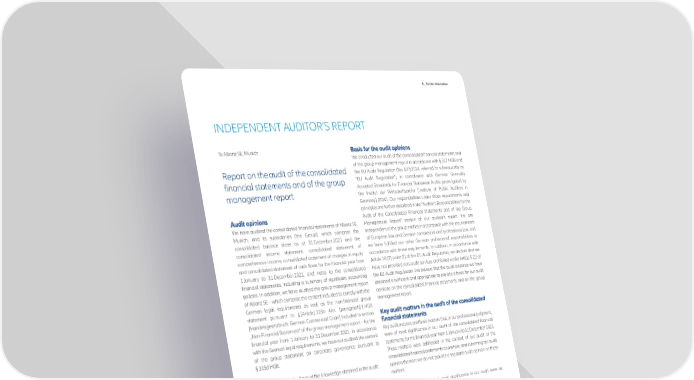 E _ Further Information INDEPENDENT AUDITOR’S REPORT To Allianz SE, Munich We conducted our audit of the consolidated financial statements and of the group management report in accordance with § 317 HGB and Report on the audit of the consolidated the EU Audit Regulation (No. 537/2014, referred to subsequently as financial statements and of the group “EU Audit Regulation”) in compliance with German Generally Accepted Standards for Financial Statement Audits promulgated by management report the Institut der Wirtschaftsprüfer [Institute of Public Auditors in Germany] (IDW). Our responsibilities under those requirements and principles are further described in the “Auditor’s Responsibilities for the Audit of the Consolidated Financial Statements and of the Group We have audited the consolidated financial statements of Allianz SE, Management Report“ section of our auditor’s report. We are Munich, and its subsidiaries (the Group), which comprise the independent of the group entities in accordance with the requirements consolidated balance sheet as at 31 December 2021 and the of European law and German commercial and professional law, and consolidated income statement, consolidated statement of we have fulfilled our other German professional responsibilities in comprehensive income, consolidated statement of changes in equity accordance with these requirements. In addition, in accordance with and consolidated statement of cash flows for the financial year from Article 10 (2) point (f) of the EU Audit Regulation, we declare that we 1 January to 31 December 2021, and notes to the consolidated have not provided non-audit services prohibited under Article 5 (1) of financial statements, including a summary of significant accounting the EU Audit Regulation. We believe that the audit evidence we have policies. In addition, we have audited the group management report obtained is sufficient and appropriate to provide a basis for our audit of Allianz SE – which comprise the content included to comply with the opinions on the consolidated financial statements and on the group German legal requirements as well as the non-financial group management report. statement pursuant to § [Article] 315b Abs. [paragraph] 1 HGB [Handelsgesetzbuch: German Commercial Code] included in section „Non-Financial Statement“ of the group management report – for the financial year from 1 January to 31 December 2021. In accordance Key audit matters are those matters that, in our professional judgment, with the German legal requirements, we have not audited the content were of most significance in our audit of the consolidated financial of the group statement on corporate governance pursuant to statements for the financial year from 1 January to 31 December 2021. § 315d HGB. These matters were addressed in the context of our audit of the consolidated financial statements as a whole, and in forming our audit In our opinion, on the basis of the knowledge obtained in the audit, opinion thereon; we do not provide a separate audit opinion on these matters. − the accompanying consolidated financial statements comply, in all material respects, with the IFRSs as adopted by the EU and the In our view, the matters of most significance in our audit were as additional requirements of German commercial law pursuant to follows: § 315e Abs. 1 HGB and, in compliance with these requirements, give a true and fair view of the assets, liabilities, and financial ❶ Measurement of certain technical assets and liabilities as well as position of the Group as at 31 December 2021, and of its financial certain financial liabilities carried at fair value (Level 3) in life and performance for the financial year from 1 January to health insurance 31 December 2021, and ❷ Measurement of certain technical provisions in property-casualty − the accompanying group management report as a whole insurance provides an appropriate view of the Group’s position. In all ❸ Accounting treatment of the legal risks in connection with AllianzGI material respects, this group management report is consistent with U.S. Structured Alpha Funds the consolidated financial statements, complies with German legal requirements and appropriately presents the opportunities Our presentation of these key audit matters has been structured in and risks of future development. Our audit opinion on the group each case as follows: management report does not cover the content of the group statement on corporate governance referred to above. ① Matter and issue Pursuant to § 322 Abs. 3 Satz [sentence] 1 HGB, we declare that our ② Audit approach and findings audit has not led to any reservations relating to the legal compliance ③ Reference to further information of the consolidated financial statements and of the group management report. Annual Report 2021 − Allianz Group 197