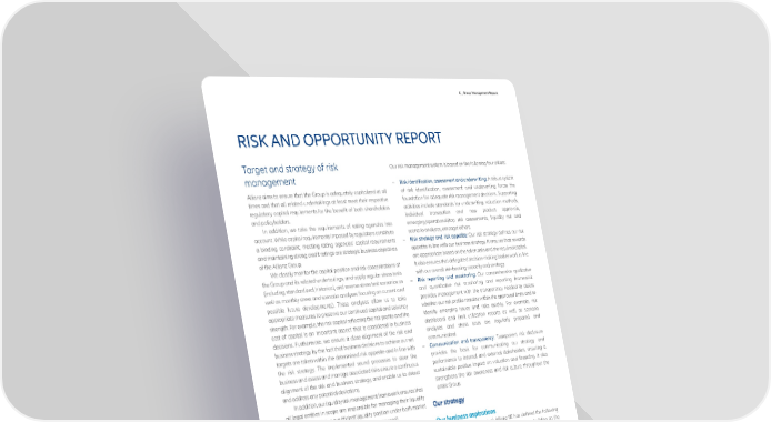 C _ Group Management Report RISK AND OPPORTUNITY REPORT Target and strategy of risk Our risk management system is based on the following four pillars: management − Risk identification, assessment and underwriting: A robust system Allianz aims to ensure that the Group is adequately capitalized at all of risk identification, assessment and underwriting forms the times and that all related undertakings at least meet their respective foundation for adequate risk management decisions. Supporting regulatory capital requirements for the benefit of both shareholders activities include standards for underwriting, valuation methods, and policyholders. individual transaction and new product approvals, In addition, we take the requirements of rating agencies into emerging/operational/top risk assessments, liquidity risk and account. While capital requirements imposed by regulators constitute scenario analyses, amongst others. a binding constraint, meeting rating agencies’ capital requirements − Risk strategy and risk appetite: Our risk strategy defines our risk and maintaining strong credit ratings are strategic business objectives appetite in line with our business strategy. It ensures that rewards of the Allianz Group. are appropriate based on the taken risks and the required capital. We closely monitor the capital position and risk concentrations of It also ensures that delegated decision-making bodies work in line the Group and its related undertakings, and apply regular stress tests with our overall risk-bearing capacity and strategy. (including standardized, historical, and reverse stress test scenarios as − Risk reporting and monitoring: Our comprehensive qualitative well as monthly stress and scenario analyses focusing on current and and quantitative risk monitoring and reporting framework possible future developments). These analyses allow us to take provides management with the transparency needed to assess appropriate measures to preserve our continued capital and solvency whether our risk profile remains within the approved limits and to strength. For example, the risk capital reflecting the risk profile and the identify emerging issues and risks quickly. For example, risk cost of capital is an important aspect that is considered in business dashboard and limit utilization reports as well as scenario decisions. Furthermore, we ensure a close alignment of the risk and analyses and stress tests are regularly prepared and business strategy by the fact that business decisions to achieve our set communicated. targets are taken within the determined risk appetite and in line with − Communication and transparency: Transparent risk disclosure the risk strategy. The implemented sound processes to steer the provides the basis for communicating our strategy and business and assess and manage associated risks ensure a continuous performance to internal and external stakeholders, ensuring a alignment of the risk and business strategy, and enable us to detect sustainable positive impact on valuation and financing. It also and address any potential deviations. strengthens the risk awareness and risk culture throughout the In addition, our liquidity risk management framework ensures that entire Group. all legal entities in scope are responsible for managing their liquidity risks and maintaining a sufficient liquidity position under both market and business conditions (expected as well as stressed). Our business aspirations The Board of Management of Allianz SE has defined the following Risk governance system objectives for Allianz Group’s medium-term strategy, building on the success of the efforts to simplify the company, with the motto “Simplicity at Scale”: As a provider of financial services, we consider risk management to be a core competency and an integral part of our business. Our risk − Outperform: We seek to move ahead of our competitors, both management framework covers all operations and subsidiaries within traditional businesses and disruptors, to drive profitable growth. the Group in proportion to the inherent risks of their activities, ensuring − Transform: We seek to become simpler and deeply digital, and to that risks across the Group are consistently identified, analyzed, put – in addition to the customer – scalability at the heart of our assessed, and adequately managed. The key elements of our risk actions. management framework are: − Rebalance: We seek to build leading positions in large, profitable, and fast-growing geographies as well as in new areas of business. − Promotion of a strong risk management culture, supported by a An increased focus will be placed on an organic rebalancing of the robust risk governance structure. business mix. − Consistent and proportional application of an integrated risk capital framework to protect our capital base and support These objectives have been translated into clear ambitions for the effective capital management. period 2022 to 2024. With regard to financial performance, we strive − Integration of risk considerations and capital needs into for a return on equity (excluding unrealized gains/losses on bonds) of management and decision-making processes by attributing risk more than 13 %, while growing our earnings per share from € 21 and allocating capital to business (expected baseline full year 2021, as communicated in the Allianz segments, products, and strategies. Annual Report 2021 − Allianz Group 97