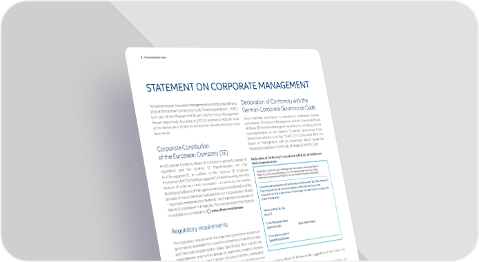 B _ Corporate Governance STATEMENT ON CORPORATE MANAGEMENT The Statements on Corporate Management according to §§ 289f and Declaration of Conformity with the 315d of the German Commercial Code (“Handelsgesetzbuch – HGB”) German Corporate Governance Code form part of the Management Report and the Group Management Report, respectively. According to § 317 (2) sentence 6 HGB, the audit Good corporate governance is essential for sustainable business of the disclosures is limited to whether the relevant disclosures have performance. The Board of Management and the Supervisory Board been made. of Allianz SE therefore attach great importance to complying with the recommendations of the German Corporate Governance Code (hereinafter referred to as the “Code”). On 16 December 2021, the Corporate Constitution Board of Management and the Supervisory Board issued the of the European Company (SE) following Declaration of Conformity of Allianz SE with the Code: As a European Company, Allianz SE is subject to special European SE Declaration of Conformity in accordance with § 161 of the German regulations and the German SE Implementation Act (“SE- Stock Corporation Act Ausführungsgesetz”), in addition to the German SE Employee Declaration of Conformity by the Management Board and the Supervisory Board of Involvement Act (“SE-Beteiligungsgesetz”). Notwithstanding, the main Allianz SE with the recommendations of the German Corporate Governance Code features of a German stock corporation – in particular the two-tier Commission in accordance with § 161 of the German Stock Corporation Act (AktG) board system (Board of Management and Supervisory Board) and the principle of equal employee representation on the Supervisory Board Since the last Declaration of Conformity as of December 10, 2020, Allianz SE has complied with all recommendations of the German Corporate – have been maintained by Allianz SE. The Corporate Constitution of Governance Code in the version of December 16, 2019 and will comply with Allianz SE is laid down in its Statutes. The current version of the Statutes them in the future. is available on our website at www.allianz.com/statutes. Munich, December 16, 2021 Allianz SE Regulatory requirements For the Management Board: The regulatory requirements for corporate governance (system of Signed Oliver Bäte Signed Renate Wagner governance) applicable for insurance companies, insurance groups, For the Supervisory Board: and financial conglomerates apply. Specifically, they include the Signed Michael Diekmann establishment and further design of significant control functions (independent risk control function, actuarial function, compliance function, and internal audit) as well as general principles for a sound business organization. These regulatory requirements are applicable In addition, Allianz SE follows all the suggestions of the Code in its throughout the Group in accordance with the principle of 16 December 2019 version. proportionality. The implementation of the regulatory requirements The Declaration of Conformity and further information on is supported by written guidelines issued by the Board of corporate governance at Allianz can be found on our website at Management of Allianz SE. Furthermore, Solvency II requires the www.allianz.com/corporate-governance. publication of qualitative and quantitative information including a market value balance sheet. Details on the implementation of the regulatory requirements for corporate governance by Allianz SE Function of the Board of Management and by the Allianz Group can be found in the Solvency and Financial and the composition and functions of Condition Report of Allianz SE and of the Allianz Group, which are published on our website at www.allianz.com/sfcr. committees Since 1 January 2022, the Board of Management of Allianz SE has eleven members. Its members may not, in general, be older than 62 years of age. The Board of Management is responsible for setting business objectives and the strategic direction, for coordinating and supervising the operating entities, and for implementing and overseeing an efficient risk management system. The Board of Management also prepares the annual financial statements of Allianz SE, the Allianz Group’s consolidated financial statements, the market value balance sheet, and the interim report. 16 Annual Report 2021 − Allianz Group