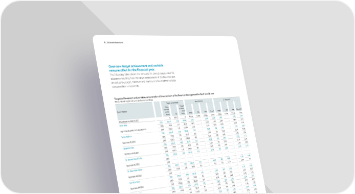 B _ Corporate Governance Overview target achievement and variable remuneration for the financial year. The following table shows the amounts for annual payout and LTI- allocation resulting from the target achievement of the financial year as well as the target, minimum and maximum amount of the variable compensation components. Target achievement and variable remuneration of the members of the Board of Management for the financial year € thou (total might not sum up due to rounding) Target achievement Annual bonus LTI allocation1 Board member Group Target financial achieve- perfor- ment mance ICF factor Target Min Max Payout Target Min Max Allocation Active board members in 2021 % 0.8-1.2 % € thou € thou € thou € thou € thou € thou € thou € thou Oliver Bäte 2021 103.47 1.06 109.68 1,593 - 2,390 1,748 2,867 - 4,301 3,145 Appointed: 01/2008; CEO since 05/2015 2020 75.58 1.17 88.43 1,422 - 2,133 1,257 2,559 - 3,839 2,263 2019 108.72 1.13 122.85 1,422 - 2,133 1,747 2,559 - 3,839 3,144 Sergio Balbinot 2021 103.47 1.06 109.68 813 - 1,220 892 1,463 - 2,195 1,605 Appointed: 01/2015 2020 75.58 1.16 87.67 813 - 1,220 713 1,463 - 2,195 1,283 2019 108.72 1.11 120.68 813 - 1,220 981 1,463 - 2,195 1,766 Jacqueline Hunt 2021 103.47 0.80 82.78 813 - 1,220 673 1,463 - 2,195 1,211 07/2016 until 09/2021 2020 75.58 1.14 86.16 813 - 1,220 700 1,463 - 2,195 1,261 2019 108.72 1.10 119.59 813 - 1,220 972 1,463 - 2,195 1,750 Dr. Barbara Karuth-Zelle 2021 103.47 1.04 107.61 813 - 1,220 875 1,463 - 2,195 1,574 Appointed: 01/2021 2020 - - - - - - - - - - - 2019 - - - - - - - - - - - Dr. Klaus-Peter Röhler 2021 103.47 1.05 108.64 813 - 1,220 883 1,463 - 2,195 1,589 Appointed: 04/2020 2020 75.58 1.15 86.92 611 - 917 531 1,100 - 1,650 956 2019 - - - - - - - - - - - Ivan de la Sota 2021 103.47 0.98 101.40 813 - 1,220 824 1,463 - 2,195 1,483 Appointed: 04/2018 2020 75.58 1.11 83.89 813 - 1,220 682 1,463 - 2,195 1,227 2019 108.72 0.95 103.28 813 - 1,220 840 1,463 - 2,195 1,511 Giulio Terzariol 2021 103.47 1.04 107.61 813 - 1,220 875 1,463 - 2,195 1,574 Appointed: 01/2018 2020 75.58 1.14 86.16 813 - 1,220 700 1,463 - 2,195 1,261 2019 108.72 1.07 116.33 813 - 1,220 946 1,463 - 2,195 1,702 Dr. Günther Thallinger 2021 103.47 1.04 107.61 813 - 1,220 875 1,463 - 2,195 1,574 Appointed: 01/2017 2020 75.58 1.14 86.16 813 - 1,220 700 1,463 - 2,195 1,261 2019 108.72 1.07 116.33 813 - 1,220 946 1,463 - 2,195 1,702 Christopher Townsend 2021 103.47 1.04 107.61 813 - 1,220 875 1,463 - 2,195 1,574 Appointed: 01/2021 2020 - - - - - - - - - - - 2019 - - - - - - - - - - - Renate Wagner 2021 103.47 1.05 108.64 813 - 1,220 883 1,463 - 2,195 1,589 Appointed: 01/2020 2020 75.58 1.14 86.16 813 - 1,220 700 1,463 - 2,195 1,261 2019 - - - - - - - - - - - Dr. Andreas Wimmer2 2021 103.47 1.00 103.47 205 - 308 226 369 - 554 407 Appointed: 10/2021 2020 - - - - - - - - - - - 2019 - - - - - - - - - - - 1_Derived by multiplying the LTI target amount by the total target achievement factor. 2_Annual bonus and LTI allocation pro rata for three months. Payout determined using the weighted average of the target achievement of Allianz Lebensversicherungs-AG (126.5 %: 110 % company target achievement and 1.15 ICF) with a weighting of 30 % and the Allianz SE target achievement with a weighting of 70 %. 40 Annual Report 2021 − Allianz Group
