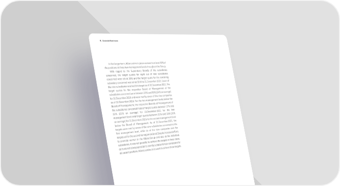 B _ Corporate Governance In the longer term, Allianz aims to place women in at least 30 % of the positions at these two management levels throughout the Group. With regard to the Supervisory Boards of the subsidiaries concerned, the target quotas for eight out of nine subsidiaries concerned were set at 30 % and the target quota for the remaining subsidiary concerned was set at 33 % for 31 December 2021. Seven of the nine subsidiaries reached this target as of 31 December 2021. The target quotas for the respective Board of Management of the subsidiaries concerned were between 20 % and 30 % (24 % on average) for 31 December 2021 and were met by seven of the nine companies as of 31 December 2021. For the two management levels below the Board of Management, the respective Boards of Management of the subsidiaries concerned had set target quotas between 17 % and 33 % (23 % on average) for 31 December 2021 for the first management level and target quotas between 20 % and 33 % (26 % on average) for 31 December 2021 for the second management level below the Board of Management. As of 31 December 2021, the targets were met by seven of the nine subsidiaries concerned at the first management level, while six of the nine companies met the targets set for the second management level. Despite increased efforts to promote women in the Allianz Group and also at the individual subsidiaries, it was not possible to achieve the targets in these cases, as it was not always possible to identify suitable female candidates for all vacant positions. Allianz continues to work to achieve these targets. 24 Annual Report 2021 − Allianz Group