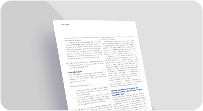 E _ Further Information the executive directors' assessments with regard to the legal financial statements that are free from material misstatement, proceedings and investigations. whether due to fraud or error. As part of our audit, we also assessed whether the required In preparing the consolidated financial statements, the executive criteria for recognizing a provision are met and whether the directors are responsible for assessing the Group’s ability to continue assessment of the executive directors have been appropriately as a going concern. They also have the responsibility for disclosing, as considered in the measurement of the provision. We were able to applicable, matters related to going concern. In addition, they are satisfy ourselves that the assessment of the legal risks in responsible for financial reporting based on the going concern basis connection with AllianzGI U.S. Structured Alpha Funds and the of accounting unless there is an intention to liquidate the Group or to executive directors' assessment for recognizing and measuring the cease operations, or there is no realistic alternative but to do so. provision were sufficiently documented and substantiated. Furthermore, the executive directors are responsible for the preparation of the group management report that, as a whole, ③ The Company’s disclosures relating to the aforementioned legal provides an appropriate view of the Group’s position and is, in all disputes are contained in section 37 of the notes to the material respects, consistent with the consolidated financial consolidated financial statements. statements, complies with German legal requirements, and appropriately presents the opportunities and risks of future development. In addition, the executive directors are responsible for The executive directors are responsible for the other information. The such arrangements and measures (systems) as they have considered other information comprises the group statement on corporate necessary to enable the preparation of a group management report governance pursuant to § 315d HGB as an unaudited part of the that is in accordance with the applicable German legal requirements, group management report. and to be able to provide sufficient appropriate evidence for the assertions in the group management report. The other information comprises further The supervisory board is responsible for overseeing the Group’s financial reporting process for the preparation of the consolidated − the remuneration report pursuant to § 162 AktG [Aktiengesetz: financial statements and of the group management report. German Stock Corporation Act], for which the supervisory board is also responsible − all remaining parts of the group annual report – excluding cross-references to external information – with the exception of the audited consolidated financial statements, the audited Our objectives are to obtain reasonable assurance about whether the group management report and our auditor’s report consolidated financial statements as a whole are free from material misstatement, whether due to fraud or error, and whether the group Our audit opinions on the consolidated financial statements and on management report as a whole provides an appropriate view of the the group management report do not cover the other information, and Group’s position and, in all material respects, is consistent with the consequently we do not express an audit opinion or any other form of consolidated financial statements and the knowledge obtained in the assurance conclusion thereon. audit, complies with the German legal requirements and appropriately presents the opportunities and risks of future development, as well as In connection with our audit, our responsibility is to read the other to issue an auditor’s report that includes our audit opinions on the information mentioned above and, in so doing, to consider whether consolidated financial statements and on the group management the other information report. Reasonable assurance is a high level of assurance but is not a − is materially inconsistent with the consolidated financial guarantee that an audit conducted in accordance with § 317 HGB and statements, with the group management report disclosures the EU Audit Regulation and in compliance with German Generally audited in terms of content or with our knowledge obtained in Accepted Standards for Financial Statement Audits promulgated by the audit, or the Institut der Wirtschaftsprüfer (IDW) will always detect a material − otherwise appears to be materially misstated. misstatement. Misstatements can arise from fraud or error and are considered material if, individually or in the aggregate, they could reasonably be expected to influence the economic decisions of users taken on the basis of these consolidated financial statements and this group management report. The executive directors are responsible for the preparation of the consolidated financial statements that comply, in all material respects, We exercise professional judgment and maintain professional with IFRSs as adopted by the EU and the additional requirements of skepticism throughout the audit. We also: German commercial law pursuant to § 315e Abs. 1 HGB and that the consolidated financial statements, in compliance with these − Identify and assess the risks of material misstatement of the requirements, give a true and fair view of the assets, liabilities, financial consolidated financial statements and of the group management position, and financial performance of the Group. In addition, the report, whether due to fraud or error, design and perform audit executive directors are responsible for such internal control as they procedures responsive to those risks, and obtain audit evidence have determined necessary to enable the preparation of consolidated that is sufficient and appropriate to provide a basis for our audit 200 Annual Report 2021 − Allianz Group