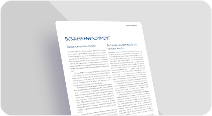 C _ Group Management Report BUSINESS ENVIRONMENT 1 Economic environment 2021 Business environment 2021 for the The second year of the COVID-19 pandemic differed from the previous insurance industry year in one key aspect: Effective vaccines against the virus became For insurance companies, 2021 was a mixed year. On the one hand, available, marking the start of an unprecedented global vaccination the strong economic upswing, increased risk awareness of both campaign. By year-end 2021, a total of over 9 billion vaccine doses had households and companies, and rising prices (especially in commercial been administered. While this did not end the pandemic – viral mutations lines) all created a tailwind for premium income. On the other hand, and rising case rates continued to keep the world on tenterhooks – it several factors weighed on profitability. First and foremost, the insured helped mitigate its economic impact: Containment measures became less losses of natural catastrophes: Globally, 2021 was one of the most stringent; both people and companies increasingly learned to live with the expensive years ever; for German insurers, it was the most costly due virus. to the flood disaster in the summer. At the same time, the COVID-19 This was reflected in global growth figures: After the sharp slump pandemic caused further losses – in particular, excess mortality in in 2020 (-3.4 %), the world’s GDP increased by 5.3 % in 2021, the many countries – as well as burdens from rising inflation. In some strongest growth in almost 50 years. All regions benefited from this sectors, prices for commodities, materials and parts increased strong recovery; however, while growth rates in North America, Europe, significantly, making claims settlement more expensive, for example in and Asia averaged more than 5 %, GDP growth in Africa was only 3 % – motor and property. Last but not least, virtually unchanged low interest not least due to the sluggish progress of vaccination. rates continued to be a very challenging environment for investments. The downside of the recovery was a rise in prices. Fueled by generous Sustainability finally became the guiding business maxim in 2021. fiscal packages and record-high savings, a boom in consumer durables This no longer relates solely to environmental issues, although these set in – a consequence of ongoing restrictions for contact-intensive continue to dominate. But at the same time, customers, employees services. In many cases, the surging demand overstretched the supply and the general public, for example, expect companies to be side, leading to bottlenecks and parts shortages, which – together with committed to diversity and to combating inequality as well. rising energy prices – caused a sharp increase in inflation. Towards the Looking at the premiums development in 2021, in the property- end of 2021, this forced many central banks to start withdrawing their casualty sector we observed increased premium growth, reflecting the extremely expansive monetary policy or at least to announce normalization of business in the wake of the economic upturn. corresponding steps. The U.S. Federal Reserve Bank reduced its bond Commercial lines in particular continued to benefit from rising prices. purchases; the European Central Bank held out the prospect of doing so That said, profitability remained under pressure: In addition to the in 2022. factors reported for previous years – on the one hand, declining The markets remained largely unimpressed by the emerging turn investment income due to persistently low yields; on the other hand, in interest rates. Supported by strong corporate earnings and capital rising claims due to the climate-induced increase in natural inflows, the stock markets rushed from record to record. The U.S. market, catastrophes – 2021 brought on another negative factor: The rapid rise as measured by the market-wide S&P 500 index, set the pace with a in inflation significantly increased costs in some lines of business, 27 % gain; European stocks (Euro STOXX 50) were close behind at 21 %. especially property and motor. This strong performance was also due to the subdued reaction of rates In the life sector, premium income recovered strongly in 2021, due to the strong pick-up in growth and inflation. Yields on 10-year to the growing demand for risk products: Many households were keen benchmark bonds remained at a very low level by historical standards, to close their insurance gap with regard to mortality risks; at the same rising just slightly to 1.5 % in the United States and -0.2 % in Europe by time, savings products benefited from both the favorable year-end 2021. As a result, financing conditions for governments and development of the markets and the high level of household savings. companies remained extremely favorable. In terms of profitability, the interest rate environment remained the biggest challenge in 2021, further compounded by significantly increased mortality in some markets. 1_At the date of the publication of this report, not all general market data for the year 2021 used in the chapter Business Environment was final. Also, please note that the information provided in this chapter is based on our estimates. Annual Report 2021 − Allianz Group 75