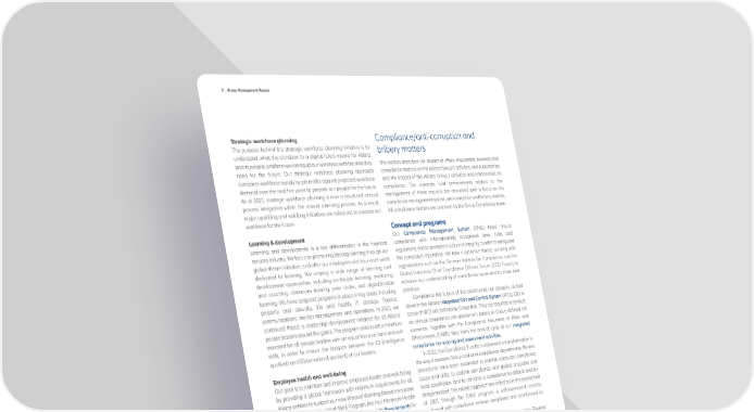 C _ Group Management Report Strategic workforce planning Compliance/anti-corruption and The purpose behind the strategic workforce planning initiative is to bribery matters understand what the transition to a digital future means for Allianz and its people, and how we can equip our workforce with the skills they This section describes the impact of ethics, responsible business and need for the future. Our strategic workforce planning approach compliance matters on the Allianz Group´s activities, and relationships compares workforce supply by job profile against projected workforce and the impact of the Allianz Group´s activities and relationships on demand over the next five years to prepare our people for the future. compliance. The concepts and achievements related to the As of 2021, strategic workforce planning is now a structured annual management of these impacts are described with a focus on the process integrated within the annual planning process. As a result, compliance management system, anti-corruption and bribery matters. major upskilling and reskilling initiatives are rolled-out to prepare our All compliance matters are overseen by the Group Compliance team. workforce for the future. Learning & development Our Compliance Management System (CMS) helps ensure Learning and development is a key differentiator in the financial compliance with internationally recognized laws, rules and services industry. We focus on promoting lifelong learning through our regulations, and to promote a culture of integrity in order to safeguard global #learn initiative, and offer our employees one hour each week the company's reputation. We take a proactive stance, working with dedicated to learning. We employ a wide range of learning and organizations such as the German Institute for Compliance and the development approaches, including on-the-job learning, mentoring Global Insurance Chief Compliance Officers Forum (CCO Forum) to and coaching, classroom training, peer circles, and digital/mobile enhance our understanding of compliance issues and to share best learning. We have targeted programs in place in key areas, including practices. property and casualty, life and health, IT, strategy, finance, Compliance risk is part of the operational risk category, as laid communications, market management and operations. In 2021, we down in the Allianz Integrated Risk and Control System (IRCS). OEs in continued #lead: a leadership development initiative for all Allianz scope of IRCS are defined by Group Risk. They are required to conduct people leaders around the globe. The program aims to set a minimum an annual compliance risk assessment based on Group-defined risk standard for all people leaders with an equal focus on hard and soft scenarios. Together with the Compliance Assurance of Risks and skills, in order to ensure the balance between the IQ (intelligence Effectiveness (CARE), they form the annual cycle of our integrated quotient) and EQ (emotional quotient) of our leaders. compliance risk scoping and assessment activities. In 2021, the Compliance Function underwent a transformation in Employee health and well-being the way it assesses Group and local compliance departments. Review Our goal is to maintain and improve employee health and well-being procedures have been expanded to confirm adequate compliance by providing a global framework with minimum requirements for all scope and skills, to confirm compliance with global programs and Allianz entities to support our new Ways of Working. Based on a pulse local specificities, and to reinforce a compliance-by-default and by- survey, we merged the Work Well Program into four Minimum Health design mindset. This holistic approach was rolled out in the second half Requirements to drive action. The Minimum Health Requirements for of 2021 through the CARE program, a self-assessment exercise all operating entities are: reinforced with compliance reviews; completed and coordinated by Group Compliance. 1. Access to professional psychological support for all employees Compliance Reviews are supplemented by Targeted Reviews worldwide, which assess the implementation status and effectiveness of programs 2. Training people leaders to maintain health and well-being in their such as Antitrust, Customer Protection, etc. The benefit of this multi- teams, faceted review and confirmation strategy is that operating entities are 3. Touch points to collect employee feedback on their health and monitored more frequently and are engaged in more holistic well-being, assurance activities. 4. Meeting Free Calendar Days @Allianz. An online tool for compliance issues management provides an overview of issues detected in the course of the above activities. It Health and well-being managers at each operating entity are requires reporting on mitigating activities as well as on follow-up responsible for driving activities to implement the Minimum Health procedures, including a review of actions undertaken and Requirements. We also rolled out the Allianz health app – Well documented in the tool. Together. The aim of this app is to combine the topics of health and The information gathered through the issue management tool sustainability under one holistic platform to motivate our employees provides the primary basis of reports to the Group Board and the to exercise more, live more healthily and – at the same time – protect Allianz SE Supervisory Board’s Audit Committee. An Integrity the environment. Committee, chaired by Group Compliance, reviews all activities and issues related to misconduct and/or violations of internal/external rules and regulations, and Code of Conduct infractions, including reports of actions to follow up on whistleblowing cases. 70 Annual Report 2021 − Allianz Group