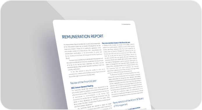 B _ Corporate Governance REMUNERATION REPORT The Remuneration Report describes the structure and arrangements of the remuneration system for the Board of Management and the In addition to the situation and impact of the global COVID-19 Supervisory Board of Allianz SE. It explains the application of the pandemic on overall economic conditions, as well as on the insurance remuneration system in the financial year 2021, using detailed and industry and Allianz employees, other key issues included the risk individualized specifications on the remuneration of current and strategy and the Board of Management’s planning for both the former members of the Board of Management and the Supervisory financial year 2022 and the three-year period from 2022 to 2024. Board. Cyber risk security and the impact of rising inflation rates on the The report was created jointly by the Board of Management and insurance business were also regularly discussed. Furthermore, the the Supervisory Board, and takes into consideration the requirements Supervisory Board dealt in depth with personnel matters relating to of § 162 of the German Stock Corporation Act (AktG), and the the Board of Management as well as succession planning for the recommendations of the German Corporate Governance Code in its Board of Management and Supervisory Board, especially in the currently valid version. context of the upcoming elections to the Supervisory Board in 2022. It was also decided to allow the auditor to carry out a The Supervisory Board and various committees also discussed comprehensive, content audit of the Remuneration Report above and appropriate consideration of non-financial targets in the target-setting beyond the legal requirements of § 162(3) AktG. process for the Board of Management remuneration. The Personnel Committee of the Supervisory Board has closely followed the business development from the viewpoint of potential Review of the financial year target achievement at Group level and individual remuneration targets for the first half of the year and at year-end. Another focal point was the ongoing discussion of the lawsuit and official proceedings in The Supervisory Board had resolved minor adjustments to the connection with the AllianzGI U.S. Structured Alpha Funds, particularly remuneration system for members of the Board of Management with in the second half of 2021 and with regards to the target achievement effect from 1 January 2021. These comprise primarily the introduction for the financial year. Besides the quantitative targets for the financial of requirements or recommendations of the German Stock year 2022, the non-financial targets and appropriateness of the Corporation Act and the German Corporate Governance Code. The remuneration of the Board of Management were discussed. Changes details of these adjustments are described in the section “Other in the Board of Management were also prepared and implemented. Remuneration Principles”, “Deviation From The Remuneration System” and “Remuneration Adjustments”. The Supervisory Board also resolved to adjust the target Remuneration of the Allianz SE Board remuneration and the maximum remuneration of the Chairperson of of Management the Board of Management, to ensure the appropriateness of the remuneration. The remuneration system adjusted on this basis was presented to the Annual General Meeting under agenda item 5 for approval on Remuneration is designed to be appropriate compared to peers, given 5 May 2021. The Annual General Meeting approved the system for the the Allianz Group’s range of business activities, operating environment, remuneration of the members of the Board of Management with a and business results achieved. The aim is to ensure and promote majority of 87.14 %. The remuneration system applies to all members sustainable and value-oriented management of the company that is of the Board of Management who were active in the financial year in line with our corporate strategy. The key principles are as follows: 2021. − Support of the Group’s strategy: The design of variable compensation, and in particular of performance targets, reflects the business strategy and sustainable long-term development of Barbara Karuth-Zelle and Christopher Townsend have been members the Allianz Group. of the Board of Management since 1 January 2021. They assumed − Alignment of pay and performance: The performance-based departmental responsibility from Dr. Christof Mascher and Niran variable component of the board members’ remuneration forms a Peiris, both of whom retired from the Board of Management as of 31 significant portion of the overall remuneration, corresponding to December 2020. 70 % of the target compensation. Effective 1 October 2021, Andreas Wimmer was appointed to the − Sustainability of performance and alignment with shareholder Board of Management. He assumed responsibility for the Asset interests: A major part of the variable remuneration reflects Management division and Allianz Life in the U.S. from Jacqueline Hunt, longer-term performance, with deferred payout (64 %), and is who is acting as strategic advisor to the Chairperson of the Board of linked to the absolute and relative performance of the Allianz Management as of this date. Remuneration for the new members of share. the Board of Management was set at the same level as the other ordinary members of the Board of Management. Annual Report 2021 − Allianz Group 27