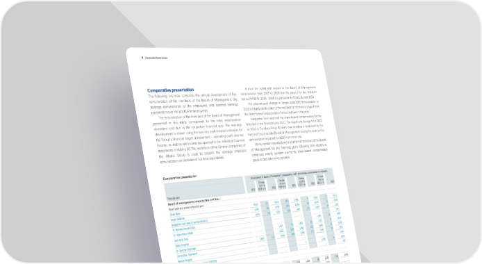B _ Corporate Governance It must be noted with regard to the Board of Management The following overview compares the annual development of the remuneration from 2017 to 2018 that the payout for the mid-term remuneration of the members of the Board of Management, the bonus (MTB) for 2016 - 2018 is reported in the financial year 2018. average remuneration of the employees, and selected earnings The year-on-year change in Sergio Balbinot’s remuneration in parameters over the last five financial years. 2020 is largely attributable to the fact that he received a payout from The remuneration of the members of the Board of Management the share-based compensation for the first time in this year. presented in the table corresponds to the total remuneration Jacqueline Hunt received the share-based compensation for the rewarded and due in the respective financial year. The earnings first time in the financial year 2021. The significant change from 2020 development is shown using the two key performance indicators for to 2021 in Dr. Klaus-Peter Röhler’s remuneration is explained by the the Group’s financial target achievement – operating profit and net fact that he joined the Board of Management during the year, so the income, as well as net income as reported in the individual financial remuneration reported for 2020 is pro rata only. statements of Allianz SE. The workforce of the German companies of Remuneration awarded and due to former members of the Board the Allianz Group is used to present the average employee of Management for the financial years following their departure remuneration on the basis of full-time equivalents. comprises mainly pension payments, share-based compensation payouts and other remuneration. Comparative presentation Development of Board of Management compensation, profit and average compensation of employees Change Change Change Change 2017 to 2018 to 2019 to 2020 to Financial year 2017 2018 in % 2018 2019 in % 2019 2020 in % 2020 2021 in % 2021 Board of management compensation in € thou Board members active in financial year Oliver Bäte 4,361 121 9,634 (47) 5,058 6 5,350 11 5,912 Sergio Balbinot 1,704 181 4,793 (58) 2,030 80 3,644 (5) 3,453 Jacqueline Hunt (end of service 09/2021) 1,691 145 4,135 (52) 1,967 (14) 1,699 39 2,357 Dr. Barbara Karuth-Zelle - - - - - - - - 1,861 Dr. Klaus-Peter Röhler - - - - - - 1,285 47 1,888 Ivan de la Sota - - 1,967 (7) 1,833 (6) 1,717 6 1,814 Giulio Terzariol - - 2,622 (26) 1,946 (13) 1,694 10 1,870 Dr. Günther Thallinger 1,609 122 3,568 (46) 1,926 (13) 1,678 10 1,852 Christopher Townsend - - - - - - - - 1,903 Renate Wagner - - - - - - 1,708 10 1,883 Dr. Andreas Wimmer (appointed: 10/2021) - - - - - - - - 472 Former members Dr. Christof Mascher (end of service 12/2020) 3,854 55 5,989 (44) 3,356 (2) 3,285 (56) 1,452 Niran Peiris (end of service 12/2020) - - 2,662 (35) 1,730 (13) 1,507 - - Dr. Axel Theis (end of service 03/2020) 1,662 185 4,729 (58) 1,988 21 2,405 (26) 1,773 Dr. Helga Jung (end of service 12/2019) 3,279 93 6,313 (50) 3,135 (54) 1,428 (5) 1,354 Dr. Dieter Wemmer (end of service 12/2017) 3,505 6 3,724 (56) 1,655 15 1,902 (19) 1,544 Dr. Werner Zedelius (end of service 12/2017) 3,337 22 4,083 (35) 2,640 (14) 2,268 (15) 1,919 Profit development in € bn Operating profit 11.10 4 11.51 3 11.86 (9) 10.75 25 13.40 Net income attributable to shareholders 6.80 10 7.46 6 7.91 (14) 6.81 (3) 6.61 Net income acc. Allianz SE financial statement 3.67 46 5.36 (14) 4.60 - 4.61 16 5.35 Average employee compensation in € thou Average compensation based on full-time equivalent 85 (2) 83 4 86 (6) 81 4 84 Individual contribution factor (ICF) structure In determining the targets for 2022, even greater account was taken New board members of the increased importance of sustainability issues. In addition to Effective 1 January 2022, Sirma Boshnakova was appointed to the group-wide sustainability targets, individual environmental, social and Board of Management. Her remuneration has been set at the same governance targets were set for each member of the Board of level as the other regular members of the Board of Management. Management for their respective areas of responsibility. 48 Annual Report 2021 − Allianz Group