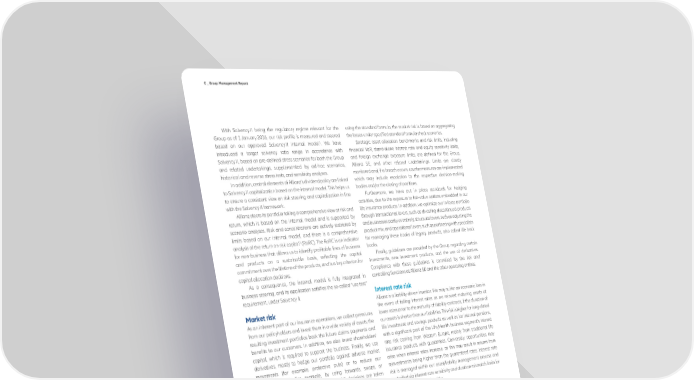 C _ Group Management Report With Solvency II being the regulatory regime relevant for the using the standard formula, the market risk is based on aggregating Group as of 1 January 2016, our risk profile is measured and steered the losses under specified standard formula shock scenarios. based on our approved Solvency II internal model1. We have Strategic asset allocation benchmarks and risk limits, including introduced a target solvency ratio range in accordance with financial VaR, stand-alone interest rate and equity sensitivity limits, Solvency II, based on pre-defined stress scenarios for both the Group and foreign exchange exposure limits, are defined for the Group, and related undertakings, supplemented by ad-hoc scenarios, Allianz SE, and other related undertakings. Limits are closely historical and reverse stress tests, and sensitivity analyses. monitored and, if a breach occurs, countermeasures are implemented In addition, central elements of Allianz’s dividend policy are linked which may include escalation to the respective decision-making to Solvency II capitalization based on the internal model. This helps us bodies and/or the closing of positions. to ensure a consistent view on risk steering and capitalization in line Furthermore, we have put in place standards for hedging with the Solvency II framework. activities, due to the exposure to fair-value options embedded in our Allianz steers its portfolio taking a comprehensive view at risk and life insurance products. In addition, we optimize our in-force portfolio return, which is based on the internal model and is supported by through transactional levers, such as divesting discontinued products scenario analyses. Risk and concentrations are actively restricted by and businesses partly or entirely, structural levers, such as adjusting the limits based on our internal model, and there is a comprehensive product mix, and operational levers, such as partnering with specialists analysis of the return on risk capital2 (RoRC). The RoRC is an indicator for managing these books of legacy products, also called life back for new business that allows us to identify profitable lines of business books. and products on a sustainable basis, reflecting the capital Finally, guidelines are provided by the Group regarding certain commitment over the lifetime of the products, and is a key criterion for investments, new investment products, and the use of derivatives. capital allocation decisions. Compliance with these guidelines is controlled by the risk and As a consequence, the internal model is fully integrated in controlling functions at Allianz SE and the other operating entities. business steering, and its application satisfies the so-called “use test” requirement, under Solvency II. Interest rate risk Allianz is a liability-driven investor. We may suffer an economic loss in the event of falling interest rates as we reinvest maturing assets at As an inherent part of our insurance operations, we collect premiums lower rates prior to the maturity of liability contracts, if the duration of from our policyholders and invest them in a wide variety of assets; the our assets is shorter than our liabilities. This risk is higher for long-dated resulting investment portfolios back the future claims payments and life investment and savings products as well as for internal pensions, benefits to our customers. In addition, we also invest shareholders’ with a significant part of the Life/Health business segment’s interest capital, which is required to support the business. Finally, we use rate risk coming from Western Europe, mainly from traditional life derivatives, mostly to hedge our portfolio against adverse market insurance products with guarantees. Conversely, opportunities may movements (for example, protective puts) or to reduce our arise when interest rates increase, as this may result in returns from reinvestment risk (for example, by using forwards, swaps, or reinvestments being higher than the guaranteed rates. Interest rate swaptions). Asset/liability management (ALM) decisions are taken risk is managed within our asset/liability management process and based on the internal model, considering both the risks and the returns controlled via interest rate sensitivity and duration mismatch limits for on the financial market. the Group and the local entities. As the fair values of our investment portfolios and liabilities depend on the changes observed in the financial markets, we are Inflation risk exposed to the risk of adverse financial market developments. The As an insurance company, we are exposed to changing inflation rates, long-dated liabilities in our Life/Health business segment and those predominantly due to our Property-Casualty insurance obligations but attributable to internal pensions contribute to interest rate risk, in also due to inflation-indexed internal pension obligations. While particular when they cannot be fully matched by available inflation assumptions are taken into account in our product investments due to long maturities. In addition, we are also exposed to development and pricing, unexpected rising rates of inflation will adverse changes in equity and real estate prices, credit spread levels, increase both future claims and expenses, leading to higher liabilities; inflation, implied volatilities, and currencies, which might impact the conversely, if future inflation rates were to be lower than assumed, value of our portfolios. liabilities would be lower than anticipated. The risk that inflation rates To measure these market risks, real-world stochastic models3 for deviate from inflation assumptions is incorporated in our internal the relevant risk factors are calibrated using historical time series to model. Potential severe structural breaks are monitored via historical generate possible future market developments. After the scenarios for and ad-hoc stress tests. all the risk factors are generated, the as