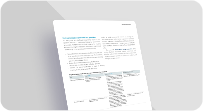 C _ Group Management Report Environmental management of our operations Further, we include environmental factors in our sourcing and We manage the most significant environmental impacts of our procurement processes, seeking to raise suppliers’ and contractors’ operations and aim to continuously improve our environmental awareness and action on climate change and the environment. In performance. Allianz strives to be a role model in the insurance 2021, we made Energy Sourcing a strategic priority and established industry in delivering its own targets on environmental protection and central governance and expertise within the Sustainable Operations climate change. For our operations, this means specifically: office. Our group-wide environmental management system (EMS) − Reduce the amount and carbon intensity of the energy consumed provides standards and controls, supports environmental data by our operations, in particular through energy-efficient planning, collection, and promotes transparent reporting on environmental construction and operation of buildings, sourcing green electricity, impacts across our operations. It guides us in monitoring and and using carbon-efficient vehicles, managing our use of resources. − Reduce the environmental impact of our business travel, − Use resources – in particular paper and water – efficiently, − Minimize the environmental impact of waste by avoiding, reducing, re-using, and recycling it as appropriate. Targets and achievements: environmental management of our operations Topic Targets 2021 Achievements 2021 Targets 2022 and beyond GHG emissions per employee Reduce carbon emissions by 30 % per − Our carbon footprint per employee was Reduce carbon emissions by 30 % per employee by 2025, against a 2019 0.9 tons (2020: 1.4). This represents a 60 employee by 2025, against a 2019 baseline. baseline. % reduction (2020: 42 %), against a 2019 baseline. − This reduction was mainly the result of increasing the share of renewable power in our energy mix, delivering a structured approach to energy management, and reduced business travel resulting from COVID-19. We expect to include GHG emissions from remote and hybrid working within the scope of our reporting to reflect upcoming infrastructure changes. Renewable electricity Source 100 % renewable electricity for our The share of renewable electricity in total Source 100 % renewable electricity for our operations by 2023. electricity used was 77 % (2020: 57 %). This operations by 2023. was mainly achieved through a combination of strategic discussions with suppliers on “green tariffs”, expanding the use of on-site renewable technologies and first-time use of “unbundled”1 renewable Energy Attribute Certificates. The scope of our environmental reporting includes all entities that, at the time of writing the reports, have been part of Allianz for at least a full reporting year. In 2021, we collected environmental data for entities corresponding to 96 % of our total employee base.2 This permits performance monitoring as well as the comparison and benchmarking of entities based on comparable system boundaries. GHG values reported refer to the sum of Scopes 1, 2, and 3 as defined in the Greenhouse Gas (GHG) Protocol. GHG emissions considered under Scope 3 include business travel, paper use, and energy-related emissions such as transmission and distribution losses. Scope 2 emissions are calculated applying market-based factors. 1_In locations where no direct renewable energy solution is available, we partly purchase Energy Attribute 2_The data is based on meter readings or invoice amounts (where available), and entities’ own estimations. Certificates (EACs) issued to renewable electricity generators operating within the same market Wherever the necessary data cannot be determined in this way and with reasonable effort, it is boundary as the claimant. extrapolated – either for entire entities or for part(s) of them – based on the relevant headcount. Annual Report 2021 − Allianz Group 63