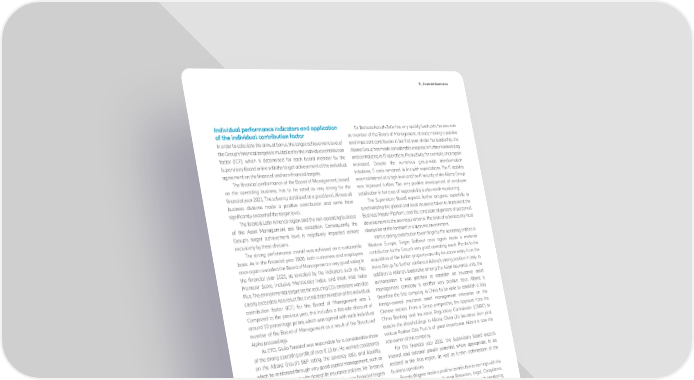 B _ Corporate Governance Individual performance indicators and application Dr. Barbara Karuth-Zelle has very quickly lived up to her new role of the individual contribution factor as member of the Board of Management, already making a positive In order to calculate the annual bonus, the target achievement level of and important contribution in her first year. Under her leadership, the the Group’s financial targets is multiplied by the individual contribution Allianz Group has made considerable progress in further harmonizing factor (ICF), which is determined for each board member by the and centralizing its IT operations. Productivity, for example, once again Supervisory Board in line with the target achievement of the individual increased. Despite the numerous group-wide transformation agreement on the financial and non-financial targets. initiatives, IT costs remained in line with expectations. The IT stability The financial performance of the Board of Management, based was maintained at a high level and the IT security of the Allianz Group on the operating business, has to be rated as very strong for the was improved further. The very positive development of employee financial year 2021. The solvency stabilized at a good level. Almost all satisfaction in her area of responsibility is also worth mentioning. business divisions made a positive contribution and some have The Supervisory Board expects further progress, especially in significantly exceeded the target level. synchronizing the global and local measures taken to implement the The Iberia & Latin America region and the non-operating business Business Master Platform, and the consistent alignment of personnel of the Asset Management are the exception. Consequently, the development to the new requirements. The topic of cybersecurity must Group’s target achievement level is negatively impacted almost always be at the forefront in a dynamic environment. exclusively by these divisions. With a strong contribution to earnings by the operating entities in The strong performance overall was achieved on a sustainable Western Europe, Sergio Balbinot once again made a material basis. As in the financial year 2020, both customers and employees contribution to the Group's very good operating result. Thanks to the once again awarded the Board of Management a very good rating in acquisition of the Italian property-casualty insurance entity from the the financial year 2021, as revealed by the indicators such as Net Aviva Group, he further reinforced Allianz’s strong position in Italy. In Promoter Score, Inclusive Meritocracy Index, and Work Well Index addition to Allianz’s leadership among the Asian insurance units, the Plus. authorization it was granted to establish an insurance asset The environmental target set for reducing CO2 emissions was also clearly exceeded. As a result, the overall determination of the individual management company is another very positive issue. Allianz is contribution factor (ICF) for the Board of Management was 1. therefore the first company in China to be able to establish a fully Compared to the previous year, this includes a flat-rate discount of foreign-owned insurance asset management enterprise on the around 10 percentage points, which was agreed with each individual Chinese market. From a Group perspective, the approval from the member of the Board of Management as a result of the Structured China Banking and Insurance Regulatory Commission (CBIRC) to Alpha proceedings. acquire the shareholdings in Allianz China Life Insurance from joint As CFO, Giulio Terzariol was responsible for a considerable share venture Partner Citic Trust is of great importance. Allianz is now the of the strong operating profit of over € 13 bn. He worked consistently sole owner of this company. on the Allianz Group’s S&P rating, the solvency ratio, and liquidity, For the financial year 2022, the Supervisory Board expects which he reinforced through very good capital management, such as internal and external growth potential, where appropriate, to be successful transactions with closed life insurance policies. Mr. Terzariol realized in the Asia region, as well as further optimization of the was also convincing in his communication of the new financial targets business operations. on the Capital Markets Day and of the preparations for the Renate Wagner made a positive contribution to earnings with the introduction of IFRS 9/17. functional units she leads – Human Resources, Legal, Compliance, The Supervisory Board expects further progress to be made in Privacy & Data Protection, and M&A. It is particularly worth mentioning 2022 on accumulation control, the management of potential the second-highest result in the history of the group-wide employee reputational risks, and in monitoring and managing the survey “Allianz Engagement Survey”, which reflects the high level of transformation and IT activities. employee satisfaction with the management of the still persistent Dr. Günther Thallinger achieved a performance that exceeded pandemic in 2021. Contrary to the market trend, employee satisfaction expectations in investment management, for which he was remained at a high level in 2021. Another positive factor is the responsible. Capital efficiency was significantly increased in the implementation of acquisitions despite adverse conditions, for Life/Health business segment through a series of capital measures. In example in Italy and Poland, and groundbreaking transactions with 2021 the return on equity in this segment was 13.0 %. Dr. Thallinger also various closed life insurance portfolios as well as the good played a significant role in further structuring and implementing the collaboration with the U.S. authorities in resolving the events Allianz Group‘s sustainability ambitions with regard to environmental, surrounding the AllianzGI U.S. Structured Alpha Funds. social and governance (ESG) issues, whereby it achieved t