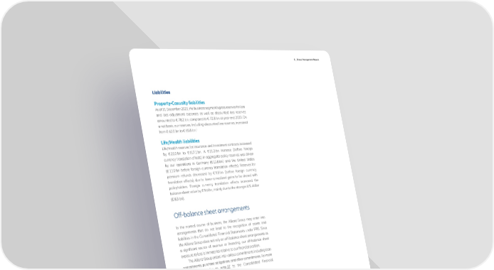 C _ Group Management Report Property-Casualty liabilities As of 31 December 2021, the business segment’s gross reserves for loss and loss adjustment expenses as well as discounted loss reserves amounted to € 78.2 bn, compared to € 72.8 bn at year-end 2020. On a net basis, our reserves, including discounted loss reserves, increased 1 from € 62.0 bn to € 65.8 bn. Life/Health liabilities Life/Health reserves for insurance and investment contracts increased by € 21.0 bn to € 617.1 bn. A € 21.2 bn increase (before foreign currency translation effects) in aggregate policy reserves was driven by our operations in Germany (€ 11.8 bn) and the United States (€ 11.0 bn before foreign currency translation effects). Reserves for premium refunds decreased by € 9.8 bn (before foreign currency translation effects), due to lower unrealized gains to be shared with policyholders. Foreign currency translation effects increased the balance sheet value by € 9.6 bn, mainly due to the stronger U.S. dollar (€ 8.3 bn). Off-balance sheet arrangements In the normal course of business, the Allianz Group may enter into arrangements that do not lead to the recognition of assets and liabilities in the Consolidated Financial Statements under IFRS. Since the Allianz Group does not rely on off-balance sheet arrangements as a significant source of revenue or financing, our off-balance sheet exposure to loss is immaterial relative to our financial position. The Allianz Group enters into various commitments including loan commitments, purchase obligations, and other commitments. For more details, please refer to note 37 to the Consolidated Financial Statements. The Allianz Group has also entered into contractual relationships with various types of structured entities. They have been designed in such a way that their relevant activities are directed by means of contractual arrangements rather than voting or similar rights. Typically, structured entities have been set up in connection with asset-backed financing and certain investment fund products. For more details on our involvement with structured entities, please refer to note 35 to the Consolidated Financial Statements. Please refer to the Risk and Opportunity Report for a description of the main concentrations of risk and other relevant risk positions. Regulatory capital adequacy For details on the regulatory capitalization of the Allianz Group, please refer to our Risk and Opportunity Report. 1_For further information about changes in the reserves for loss and loss adjustment expenses for the Property-Casualty business segment, please refer to note 14 to the Consolidated Financial Statements. Annual Report 2021 − Allianz Group 91