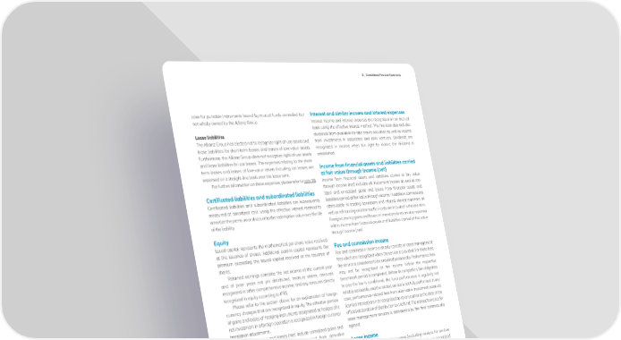 D _ Consolidated Financial Statements case for puttable instruments issued by mutual funds controlled but Interest and similar income and interest expenses not wholly owned by the Allianz Group. Interest income and interest expenses are recognized on an accrual basis using the effective interest method. This line item also includes Lease liabilities dividends from available-for-sale equity securities as well as income The Allianz Group has elected not to recognize right-of-use assets and from investments in associates and joint ventures. Dividends are lease liabilities for short-term leases and leases of low-value assets. recognized in income when the right to receive the dividend is Furthermore, the Allianz Group does not recognize right-of-use assets established. and lease liabilities for car leases. The expenses relating to the short- term leases and leases of low-value assets including car leases are Income from financial assets and liabilities carried expensed on a straight-line basis over the lease term. at fair value through income (net) For further information on these expenses, please refer to note 3 8. Income from financial assets and liabilities carried at fair value through income (net) includes all investment income as well as rea- Certificated liabilities and subordinated liabilities lized and unrealized gains and losses from financial assets and Certificated liabilities and subordinated liabilities are subsequently liabilities carried at fair value through income. In addition, commissions measured at amortized cost, using the effective interest method to attributable to trading operations and related interest expenses as amortize the premium or discount to the redemption value over the life well as refinancing and transaction costs are included in this line item. of the liability. Foreign currency gains and losses on monetary items are also reported within income from financial assets and liabilities carried at fair value Equity through income (net). Issued capital represents the mathematical per-share value received at the issuance of shares. Additional paid-in capital represents the Fee and commission income premium exceeding the issued capital received at the issuance of Fee and commission income primarily consists of asset management shares. fees which are recognized when the service is provided. For those fees, Retained earnings comprise the net income of the current year the service is considered to be provided periodically. Performance fees and of prior years not yet distributed, treasury shares, amounts may not be recognized as fee income before the respective recognized in other comprehensive income, and any amounts directly benchmark period is completed. Before its completion, the obligation recognized in equity according to IFRS. to pay the fee is conditional, the fund performance is regularly not Please refer to the section above for an explanation of foreign reliably estimable, and the related service is not fully performed. In any currency changes that are recognized in equity. The effective portion case, performance-related fees from alternative investment products of gains and losses of hedging instruments designated as hedges of a (carried interest) are not recognized as revenue prior to the date of the net investment in a foreign operation is recognized in foreign currency official declaration of distribution by the fund. The transaction price for translation adjustments. asset management services is determined by the fees contractually Unrealized gains and losses (net) include unrealized gains and agreed. losses from available-for-sale investments and from derivative financial instruments that meet the criteria for cash flow hedge Lease income accounting. Lease income from operating leases (excluding receipts for services Undated subordinated debt comprises Restricted Tier 1 notes provided such as insurance and maintenance which are recognized that do not qualify as financial liabilities under IFRS. The instruments directly as income) is recognized on a straight line basis over the lease are classified as shareholders’ equity and any related interest charges term even if the receipts are not on such a basis, for example upfront are classified as distributions from shareholders’ equity. The notes are payments. measured at their historical value or their closing value as regards exchange rates. The corresponding foreign exchange differences are Claims and insurance benefits incurred recognized as foreign currency translation adjustments in equity. These expenses consist of claims and insurance benefits incurred Non-controlling interests represent equity in subsidiaries, not during the period, including benefit claims in excess of policy account attributable directly or indirectly, to Allianz SE as parent. balances and interest credited to policy account balances. Furthermore, it includes claims handling costs directly related to the Premiums processing and settlement of claims. Reinsurance recoveries are Premiums for short-duration insurance contracts are recognized as deducted from claims and insurance benefits. revenues over the period of the contract in proportion to the amount of insurance protection provided. Premiums for long-duration Income taxes insurance contracts are recognized as earned when due. Current income taxes are calculated based on the respective local Revenues for universal life-type and investment contracts taxable income and local tax rules for the period. In addition, current represent charges assessed against the policyholders’ account income taxes presented for the period include adjustments for balances for front-end loads, net of the change in unearned revenue uncertain tax payments or tax refunds for periods not yet finally liabilities and cost of insurance, surrenders, and policy administration, assessed, excluding interest expenses and penalties on the and are included within premiums earned (net). underpayment of taxes