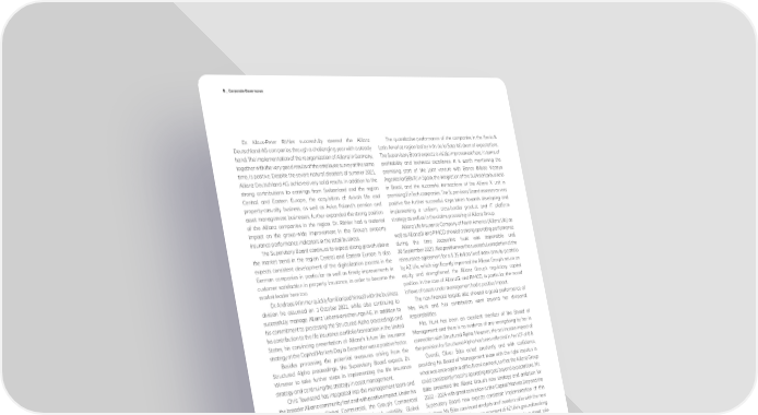 B _ Corporate Governance Dr. Klaus-Peter Röhler successfully steered the Allianz The quantitative performance of the companies in the Iberia & Deutschland AG companies through a challenging year with a steady Latin America region led by Iván de la Sota fell short of expectations. hand. The implementation of the reorganization of Allianz in Germany, The Supervisory Board expects a visible improvement here, in terms of together with the very good results of the employee survey at the same profitability and technical excellence. It is worth mentioning the time, is positive. Despite the severe natural disasters of summer 2021, promising start of the joint venture with Banco Bilbao Vizcaya Allianz Deutschland AG achieved very solid results. In addition to the Argentaria (BBVA) in Spain, the integration of the SulAmérica business strong contributions to earnings from Switzerland and the region in Brazil, and the successful transactions of the Allianz X unit in Central and Eastern Europe, the acquisition of Aviva’s life and promising FinTech companies. The Supervisory Board assesses as very property-casualty business, as well as Aviva Poland’s pension and positive the further successful steps taken towards developing and asset management businesses, further expanded the strong position implementing a uniform, cross-border product and IT platform of the Allianz companies in the region. Dr. Röhler had a material strategy as well as in the claims processing of Allianz Group. impact on the group-wide improvement in the Group’s property Allianz Life Insurance Company of North America (Allianz Life) as insurance performance indicators in the retail business. well as AllianzGI and PIMCO showed a strong operating performance The Supervisory Board continues to expect strong growth above during the time Jacqueline Hunt was responsible until the market trend in the region Central and Eastern Europe. It also 30 September 2021. Also positive was the successful completion of the expects consistent development of the digitalization process in the reinsurance agreement for a $ 35 billion fixed index annuity portfolio German companies in particular as well as timely improvements in by AZ Life, which significantly improved the Allianz Group's return on customer satisfaction in property insurance, in order to become the equity and strengthened the Allianz Group's regulatory capital market leader here too. position. In the case of AllianzGI and PIMCO, in particular, the record Dr. Andreas Wimmer quickly familiarized himself with the business inflows of assets under management had a positive impact. division he assumed on 1 October 2021, while also continuing to The non-financial targets also showed a good performance of successfully manage Allianz Lebensversicherungs-AG. In addition to Mrs. Hunt and her contribution went beyond her divisional his commitment to processing the Structured Alpha proceedings and responsibilities. his contribution to the life insurance portfolio transaction in the United Mrs. Hunt has been an excellent member of the Board of States, his convincing presentation of Allianz’s future life insurance Management and there is no evidence of any wrongdoing by her in strategy at the Capital Markets Day in December was a positive factor. connection with Structured Alpha. However, the net income impact of Besides processing the potential measures arising from the the provision for Structured Alpha has been reflected in her ICF of 0.8. Structured Alpha proceedings, the Supervisory Board expects Dr. Overall, Oliver Bäte acted prudently and with confidence, Wimmer to take further steps in implementing the life insurance providing his Board of Management team with the right impetus in strategy and continuing the strategy in asset management. what was once again a difficult environment, so that the Allianz Group Chris Townsend has integrated into the management team and could consistently meet its operating targets beyond expectations. Mr. the broader Allianz community fast and with positive impact. Under his Bäte presented the Allianz Group’s new strategy and ambition for leadership and via Global Commercial, the Group’s Commercial 2022 – 2024 with great conviction at the Capital Markets Day and the business, incl. AGCS, benefited from reduced volatility. Global Supervisory Board now expects consistent implementation of this Commercial installed a segment-focus steering approach across the strategy. Mr. Bäte convinced analysts and investors alike with the new Group to address the significant market potential in Mid-Corp. The dividend strategy and the announcement of AZ Life’s groundbreaking AGCS turnaround shows substantial progress, delivering an transactions in the United States. He was once again a great role underwriting profit, and Euler Hermes successfully exited the State model to the entire Allianz management in 2021. Support Schemes and was able to increase profits in 2021. Australia delivered on the re-platforming of the new Business Master Platform with positive results. The strong indices of the annual employee engagement survey within the units under Chris Townsend’s responsibility were encouraging. The Supervisory Board expects further improvement in the Mid- Corp business, and tangible progress in the transformation of the companies in the UK and Australia. 38 Annual Report 2021 − Allianz Group