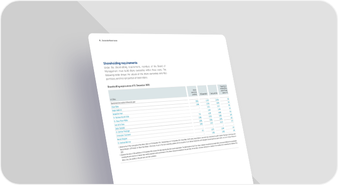 B _ Corporate Governance Under the shareholding requirements, members of the Board of Management must build share ownership within three years. The following table shows the values of the share ownership and RSU portfolios, and their proportion of base salary. Shareholding exposure as of 31 December 2021 Proportion of Share- total portfolio ownership value of base in € thou 1 2 portfolio RSU portfolio Total portfolio salary in % Board members active in financial year Oliver Bäte 3,802 9,734 13,536 708 Sergio Balbinot 1,086 5,760 6,846 702 Jacqueline Hunt - 5,671 5,671 582 Dr. Barbara Karuth-Zelle - 1,644 1,644 169 Dr. Klaus-Peter Röhler 314 4,131 4,445 456 Ivan de la Sota 1,086 4,799 5,885 604 Giulio Terzariol 1,086 4,806 5,892 604 Dr. Günther Thallinger 1,806 5,530 6,616 679 Christopher Townsend - - - - Renate Wagner 471 2,073 2,544 261 Dr. Andreas Wimmer - 1,400 1,400 144 1_Based on the XETRA closing price of the Allianz share as of 30 December 2021. Shareholdings as of 31 December 2021: Oliver Bäte: 18,309 shares; Sergio Balbinot, Ivan de la Sota, Giulio Terzariol and Dr. Günther Thallinger: 5,230 shares each. Renate Wagner: 2,270 shares, Dr. Klaus-Peter Röhler: 1,513 shares. As part of the share ownership guideline, the first acquisition for Dr. Barbara Karuth-Zelle and Christopher Townsend will take place in 2022, and for Dr. Andreas Wimmer in 2023. 2_Based on fair value of RSU portfolio as of 31 December 2021 shown in the table reporting the share-based compensation. The determination of the LTI fair values is based on an option pricing model taking into account additional input parameters, including the term structure of interest rates and the expected relative performance of the Allianz share price compared to the peer index. For the latter, simulation techniques are applied at the valuation date to determine the volatility of the Allianz stock, the volatility of the peer index and their correlation. 42 Annual Report 2021 − Allianz Group