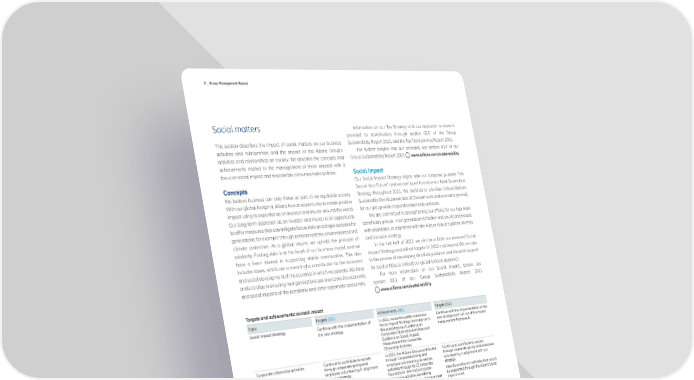 C _ Group Management Report Social matters Information on our Tax Strategy and our approach to taxes is provided to stakeholders through section 03.5 of the Group This section describes the impact of social matters on our business Sustainability Report 2021, and the Tax Transparency Report 2021. activities and relationships and the impact of the Allianz Group´s For further insights into our concepts, see section 01.4 of our activities and relationships on society. We describe the concepts and Group Sustainability Report 2021 www.allianz.com/sustainability. achievements related to the management of these impacts with a focus on social impact and responsible consumer/sales policies. Social impact Our Social Impact Strategy aligns with our company purpose “We Secure Your Future”, and we continued to evolve our Next Generation We believe business can only thrive as part of an equitable society. Strategy throughout 2021. We decided to prioritize United Nations With our global footprint, Allianz has an opportunity to create positive Sustainable Development Goal 8 (Decent work and economic growth) impact using its expertise as an investor and insurer around the world. for our group-wide corporate citizenship activities. Our long-term approach as an investor and insurer is an opportunity We are committed to strengthening our efforts for our two main to offer measures that can mitigate future risks and shape societies for beneficiary groups – next generations (children and youth) and people generations, for example through pension systems, environmental and with disabilities, in alignment with the Allianz Group´s global diversity climate protection. As a global insurer, we uphold the principle of and inclusion strategy. solidarity. Pooling risks is at the heart of our business model, and we In the first half of 2022, we aim to publish our renewed Social have a keen interest in supporting stable communities. This also Impact Strategy and will set targets for 2022 and beyond. We are also includes taxes, which are a meaningful contribution to the economic in the process of developing detailed guidance and financial support and social development of the countries in which we operate. We have for local entities to embed our global to local approach. a role to play in ensuring next generations can overcome the economic For more information on our Social Impact, please see and social impacts of the pandemic and other systematic social risks. section 03.1 of our Group Sustainability Report 2021 www.allianz.com/sustainability. Targets and achievements: societal impact Topic Targets 2021 Achievements 2021 Targets 2022 Social Impact Strategy Continue with the implementation of In 2021, we continued to evolve our Continue with the implementation of the the new strategy. Social Impact Strategy and approach. new strategy and roll out of the impact We published our Guidance on measurement framework. Corporate Citizenship Activities and Guidance on Social Impact Measurement for Corporate Citizenship Activities. Corporate citizenship activities Continue to contribute to society In 2021, the Allianz Group contributed Continue to contribute to society through corporate giving and through Corporate Giving and through corporate giving and employee employee volunteering in alignment employee volunteering as well as volunteering in alignment with our with our strategy. activities through its 12 corporate strategy. foundations. We had corporate Identify and launch activities that would citizenship activities benefiting be supported through the Allianz Social communities worldwide. We launched Impact Fund. the Allianz Social Impact Fund to foster OEs to carry out local activities in line with our strategy. Long-term global partnerships Increase the resilience and equal In 2021, our partnership with SOS CVI Continued review of our global opportunities of children and young with a focus on Emergency partnership and development of a people in 2021 by focusing specifically Preparedness & Response and Youth partnership framework for local on Emergency Preparedness & Employability programs (e.g., Corporate Citizenship activities. Response and Youth Employability YouthCan!) continued. As planned, the programs. partnership came to an end after six years at the end of 2021. 64 Annual Report 2021 − Allianz Group