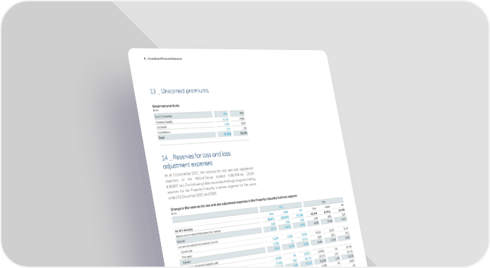 D _ Consolidated Financial Statements 13 _ Unearned premiums Unearned premiums € mn As of 31 December 2021 2020 Property-Casualty 21,163 19,681 Life/Health 6,356 5,679 Consolidation (17) (18) Total 27,501 25,341 14 _ Reserves for loss and loss adjustment expenses As of 31 December 2021, the reserves for loss and loss adjustment expenses of the Allianz Group totaled € 86,974 mn (2020: € 80,897 mn). The following table reconciles the beginning and ending reserves for the Property-Casualty business segment for the years ended 31 December 2021 and 2020. Change in the reserves for loss and loss adjustment expenses in the Property-Casualty business segment € mn 2021 2020 Gross Ceded Net Gross Ceded Net As of 1 January 68,171 (10,471) 57,700 65,414 (9,496) 55,918 Balance carry forward of discounted loss reserves 4,603 (346) 4,258 4,552 (348) 4,204 Subtotal 72,774 (10,817) 61,958 69,965 (9,844) 60,122 Loss and loss adjustments expenses incurred Current year 41,698 (4,760) 36,938 40,321 (4,007) 36,314 Prior years (1,396) 23 (1,374) (255) (176) (431) Subtotal 40,302 (4,737) 35,565 40,066 (4,183) 35,883 Loss and loss adjustments expenses paid Current year (19,383) 796 (18,587) (17,607) 503 (17,104) Prior years (17,982) 2,843 (15,139) (18,171) 2,017 (16,154) Subtotal (37,365) 3,639 (33,726) (35,778) 2,520 (33,258) Foreign currency translation adjustments and other changes1 1,842 (399) 1,443 (1,708) 691 (1,017) Changes in the consolidated subsidiaries of the Allianz Group 680 (100) 581 229 (1) 228 Subtotal 78,234 (12,413) 65,821 72,774 (10,817) 61,958 Ending balance of discounted loss reserves (4,808) 384 (4,424) (4,603) 346 (4,258) As of 31 December 73,425 (12,029) 61,397 68,171 (10,471) 57,700 1_Include effects of foreign currency translation adjustments for prior year's claims of gross € 1,257 mn (2020: € (1,639) mn) and of net € 900 mn (2020: € (1,105) mn), and for current year claims of gross € 172 mn (2020: € (409) mn) and of net € 128 mn (2020: € (275) mn). Prior years’ net loss and loss adjustment expenses incurred reflect the such as asbestos and environmental claims. The origin year of losses is changes in estimation charged or credited to the consolidated income taken into consideration by analyzing each line of business by accident statement in each year with respect to the reserves for loss and loss year. While this determines the estimates of reserves for loss and LAE adjustment expenses established as of the beginning of that year. by accident year, the effect in the consolidated income statement in During the year ended 31 December 2021, additional income of the respective calendar year combines the accident year loss ratio for € 1,374 mn (2020: € 431 mn) net was recorded in the Property- the current year with the favorable or adverse development from prior Casualty business segment in respect of losses occurring in prior years. years (run-off). During the year ended 31 December 2021, this amount, expressed as Although discounted loss reserves have been reclassified to a percentage of the net balance of the beginning of the year, was 2.2 % “Reserves for insurance and investment contracts” in the balance (2020: 0.7 %). sheet, the underlying business development of these non-life reserves is still considered in the loss ratio. Therefore the tables below show the loss development by accident year including the business development of discounted loss reserves. The analysis of loss and LAE reserves by actuaries and management is The run-off triangle, also known as the “loss triangle”, is a tabular conducted by line of business and separately for specific claim types representation of loss-related data (such as payments, loss reserves, 152 Annual Report 2021 − Allianz Group