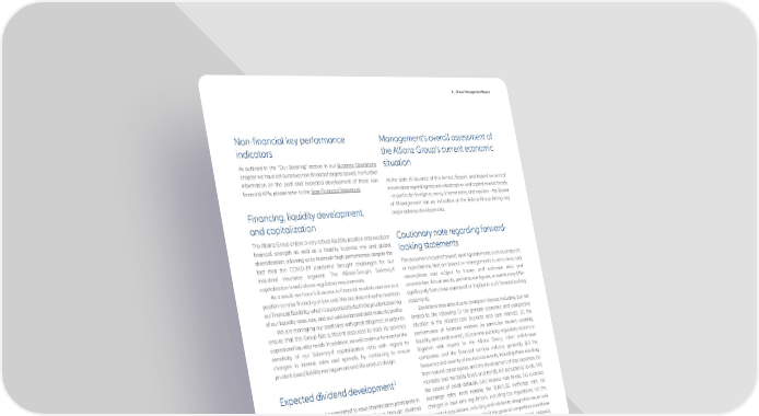 C _ Group Management Report Non-financial key performance Management’s overall assessment of indicators the Allianz Group’s current economic As outlined in the “Our Steering” section in our Business Operations situation chapter we have set ourselves non-financial targets as well. For further information on the past and expected development of these non- At the date of issuance of this Annual Report, and based on current financial KPIs, please refer to the Non-Financial Statement. information regarding natural catastrophes and capital market trends – in particular foreign currency, interest rates, and equities – the Board of Management has no indication of the Allianz Group facing any major adverse developments. Financing, liquidity development, and capitalization The Allianz Group enjoys a very robust liquidity position and excellent Cautionary note regarding forward- financial strength as well as a healthy business mix and global looking statements diversification, allowing us to maintain high performance despite the fact that the COVID-19 pandemic brought challenges for our This document includes forward-looking statements, such as prospects industrial insurance segment. The Allianz Group’s Solvency II or expectations, that are based on management's current views and capitalization is well above regulatory requirements. assumptions and subject to known and unknown risks and As a result, we have full access to financial markets and are in a uncertainties. Actual results, performance figures, or events may differ position to raise financing at low cost. We are determined to maintain significantly from those expressed or implied in such forward-looking our financial flexibility, which is supported by both the prudent steering statements. of our liquidity resources, and our well-balanced debt maturity profile. Deviations may arise due to changes in factors including, but not We are managing our portfolios with great diligence, in order to limited to, the following: (i) the general economic and competitive ensure that the Group has sufficient resources to back its solvency situation in the Allianz’s core business and core markets, (ii) the capital and liquidity needs. In addition, we will continue to monitor the performance of financial markets (in particular market volatility, sensitivity of our Solvency II capitalization ratio with regard to liquidity, and credit events), (iii) adverse publicity, regulatory actions or changes in interest rates and spreads, by continuing to ensure litigation with respect to the Allianz Group, other well-known prudent asset/liability management and life product design. companies and the financial services industry generally, (iv) the frequency and severity of insured loss events, including those resulting 1 from natural catastrophes, and the development of loss expenses, (v) Expected dividend development mortality and morbidity levels and trends, (vi) persistency levels, (vii) the extent of credit defaults, (viii) interest rate levels, (ix) currency Allianz management is committed to have shareholders participate in exchange rates, most notably the EUR/USD exchange rate, (x) the economic development of the Allianz Group through dividend changes in laws and regulations, including tax regulations, (xi) the payments. Through prudent capital management, the Allianz Group impact of acquisitions, including and related to integration issues and aims to maintain a healthy balance between achieving attractive reorganization measures, and (xii) the general competitive conditions yields and investing in profitable growth. Of the Group’s net income that, in each individual case, apply at a local, regional, national, attributable to shareholders, we will continue to pay out 50 % as a and/or global level. Many of these changes can be exacerbated by regular dividend, however, adjusted for extraordinary and volatile terrorist activities. items. Furthermore, Allianz Group’s objective is to pay a dividend per share of at least 5 % above the amount of the previous year. For 2021, the Allianz SE Board of Management and the Supervisory Board No duty to update propose a dividend of € 10.80 per share. In addition, as part of our policy to return capital to shareholders Allianz assumes no obligation to update any information or forward- on a flexible basis, Allianz SE executed six share buy-back programs looking statement contained herein, save for any information we are with an aggregate volume of € 9 bn in the period from 2017 to 2021. required to disclose by law. All of the above is subject to our sustainable Solvency II capitalization ratio above 150 % – which is considerably below our year-end 2021 level of 209 %2, and which is 30 percentage points below our minimum ambition of 180 % for the Solvency II capitalization ratio. 1_This represents management’s current state of planning and may be revised in the future. Also, note that 2_Including the application of transitional measures for technical provisions, the Solvency II capitalization the decision regarding dividend payments in any given year is subject to specific dividend proposals by ratio amounted to 239 % as of 31 December 2021. the Management and Supervisory Boards, each of which may elect to deviate, if and as appropriate, under the then prevailing circumstances, as well as to the approval of the Annual General Meeting. Annual Report 2021 − Allianz Group 89