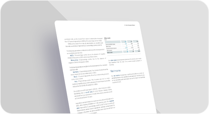 C _ Group Management Report combined ratio, as the impact from natural catastrophes increased Other result1 from 1.7 percentage points in 2020 to 3.1 percentage points in 2021. € mn Without the losses from natural catastrophes, our accident year 2021 2020 Delta loss ratio would have improved by 2.1 percentage points to 66.5 %. Fee and commission income 1,998 1,640 358 Other income 11 152 (140) The following operations contributed positively to the development of Fee and commission expenses (1,955) (1,617) (338) our accident year loss ratio: Other expenses (13) (1) (12) AGCS: 1.4 percentage points, due to the absence of negative Other result 42 175 (133) COVID-19 impacts in 2021 and strict portfolio actions. Reinsurance: 0.5 percentage points, due to the absence of negative COVID-19 impacts in 2021. Our other result worsened, mostly because the previous year’s result had benefited from the sale of an owner-occupied property in The following operations weighed on the development of our accident Germany. year loss ratio: Germany: 0.5 percentage points. The increase resulted from the severe impact of natural catastrophes in 2021. Net income Brazil: 0.3 percentage points, driven by a deteriorating situation in the motor market. Our net income increased by a significant € 1,508 mn, as both our Italy: 0.2 percentage points. This increase was due to motor operating and our non-operating results improved. The € 321 mn rise market competitiveness, and the absence of motor frequency benefits in non-operating profit was largely due to the higher non-operating induced by the COVID-19 pandemic in 2021. investment result. Our positive run-off result was € 1,374 mn – after € 431 mn in 2020 – translating into a run-off ratio of 2.6 %. Reserve releases mainly stemmed from our operations in Credit, Reinsurance, Australia as well as Central and Eastern Europe. Acquisition and administrative expenses amounted to € 14,186 mn in 2021, after totaling € 13,846 mn in the previous year. Our expense ratio improved by 0.1 percentage points to 26.7 %, due to continued improvements across several operations, partially compensated by changes in business mix and a positive prior year one-off from our operations in the United Kingdom. Operating investment income (net) € mn 2021 2020 Delta Interest and similar income (net of interest expenses) 3,151 3,061 90 Operating income from financial assets and liabilities carried at fair value through income (net) (55) (28) (27) Operating realized gains (net) 215 131 84 Operating impairments of investments (net) (25) (141) 116 Investment expenses (493) (421) (73) 1 Expenses for premiums refunds (net) (150) (45) (105) Operating investment income (net)2 2,642 2,556 86 1_Refers to policyholder participation, mainly from APR business (accident insurance with premium refunds), reported within “change in reserves for insurance and investment contracts (net)”. For further information, please refer to note 26 to the Consolidated Financial Statements. 2_The operating investment income (net) of our Property-Casualty business segment consists of the operating investment result – as shown in note 4 to the Consolidated Financial Statements – and expenses for premium refunds (net) (policyholder participation). Our operating investment income (net) increased slightly, mainly driven by higher interest and similar income (net of interest expenses). Annual Report 2021 − Allianz Group 79