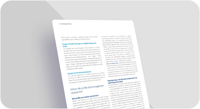 C _ Group Management Report € 3.3 bn). This is caused by a regulatory change in the risk based mechanisms are applied to ensure adherence to Allianz’s capital (RBC) factors for Allianz Life of North America. underwriting standards and monitor the quality of the portfolio and underwriting process. The underwriting processes must Impact of model changes on eligible Group own support sustainable and profitable business, secure consistency, funds align with the risk appetite of the Group and of the operating The regulatory and model changes in 2021 resulted in a € 0.2 bn entities as well as avoid undesired and/or excessive risks and increase of Own Funds which was mainly driven by the adjustment of accumulations. The full economic consequences of a pandemic the UFR, an economic scenario generator model change, and several event such as COVID-19 are uninsurable. The required capital for major model changes at the German Life/Health companies Allianz an effective protection against such an accumulation of risks Lebensversicherungs-Aktiengesellschaft and Allianz Private would require premium rates that are unattractive for the Krankenversicherungs-Aktiengesellschaft. Transferability deduction of customers, if not unaffordable. In addition, a pandemic affects surplus funds at Allianz Lebensversicherungs-Aktiengesellschaft and multiple factors such as business interruption, impact on global Allianz Private Krankenversicherungs-Aktiengesellschaft in the capital markets, increase in medical costs, and mortality. amount of € (0.4) bn from model-related SCR changes are further − Other non-financial risks: These risks are inherent to the Group’s offsetting the model changes. core business and need to be carefully managed via continuous improvements in risk identification, risk assessment, and control Impacts of transitional measures environments. This occurs through elements of the Group Risk The continued application of transitional measures on technical management framework such as the Top Risk Assessment (TRA), provisions for Allianz Lebensversicherungs-Aktiengesellschaft and Integrated Risk and Control System (IRCS), Reputational Risk Allianz Private Krankenversicherungs-Aktiengesellschaft resulted in Management Framework, and Liquidity Risk Management. an increase in the Own Funds of € 12.4 bn at the Group level. Allianz risk profile and management Financial markets are characterized by historically low interest rates 1 and risk premiums, causing some investors to look for higher-yielding assessment – and potentially higher-risk – investments. In addition to sustained low interest rates, there are several other factors that may lead to increasing market volatility. These include the challenges of Allianz’s core business as a global insurer and asset manager implementing long-term structural reforms in key eurozone countries; predominantly exposes it to a variety of risks such as underwriting risks, tensions in the relationship between the United Kingdom and the financial market and credit risks, and several other non-financial risks European Union following the exit of the United Kingdom from the (i.e., operational, reputational, liquidity, and strategic risks). The union; the uncertainty about future monetary and fiscal policies; rising execution of the Renewal Agenda may impact the potential severity populism; amplified geopolitical tensions and economic nationalism or likelihood of these existing risks, contribute towards concentrations amid the pandemic, including a worsening of the Russia-Ukraine of certain types of risk, or potentially even give rise to new risks within situation or a deterioration of the U.S.-China relationship; and a given risk category. However, from a broad perspective, the overall disruptions in global supply chains, which weigh on global trade with risk profile of Allianz has remained and is expected to remain stable. the potential of prompting long-term structural shifts in global supply “Stable” in this context means a relatively high exposure to market and chains. credit risks, a moderate exposure to underwriting risks, and a modest Another potential source of higher market volatility is the exposure to operational, business, and other risks (i.e., measured as a uncertainty around whether the currently observed higher rates of share of the Allianz Group’s Solvency II risk capital). Please refer to inflation are transitory, and the associated timing and extent of section “Solvency II Regulatory Capitalization” for further details. corresponding central bank policy measures. To support the development of a risk appetite and a risk The increasing reliance on digital technologies which has been management framework for these core risks, the Allianz Group has greatly accelerated by the COVID-19 pandemic – to ensure business elaborated the following risk management philosophy: continuity and enhance efficiency and competitiveness – increases the risk of technology obsolescence, cyberattacks, data breaches, system − Financial risks: Allianz Group’s ultimate objective is to assure that failures as well as the risk of non-compliance with increasing financial risk taking is in line with risk-bearing capacity at the regulation covering IT-related business processes. Group and legal entity level, and that it creates shareholder equity. The ongoing uncertainty around the evolution of the COVID-19 To manage financial risk effectively and avoid accumulated losses pandemic remains a significant risk. Full economic recovery is not in times of financial crisis, it is essential to clearly identify, measure, expected to occur until the health concerns are forcefully and credibly monitor, and control the risks inherent in the investment portfolios removed, i.e., highly effective medication is available or herd immunity and in insurance products, including the development of new is achieved. The timing and progress remain uncertain, and residual pro