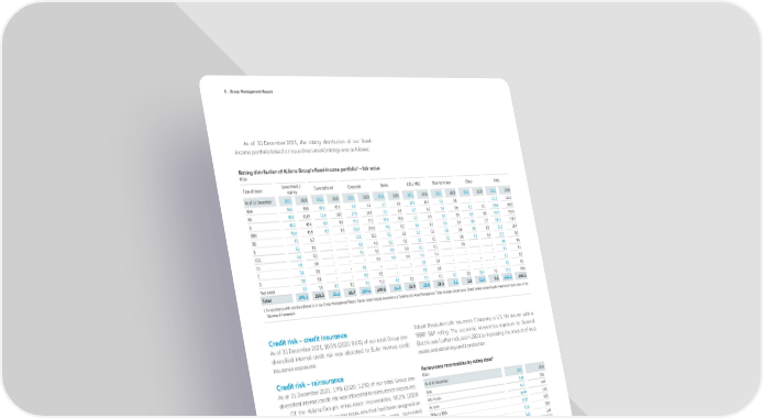 C _ Group Management Report As of 31 December 2021, the rating distribution of our fixed- income portfolio based on issue (instrument) ratings was as follows: Rating distribution of Allianz Group’s fixed-income portfolio1 – fair value € bn Type of issuer Government / Covered bond Corporate Banks ABS / MBS Short-term loan Other Total agency As of 31 December 2021 2020 2021 2020 2021 2020 2021 2020 2021 2020 2021 2020 2021 2020 2021 2020 AAA 45.5 49.5 42.6 47.7 3.3 3.2 2.7 3.0 17.5 19.1 0.1 0.0 - - 111.7 122.5 AA 99.8 111.5 12.4 18.2 27.6 24.3 3.5 4.3 6.7 6.2 0.6 0.6 0.1 0.1 150.8 165.3 A 40.2 43.4 0.3 0.4 73.5 71.1 19.4 19.0 2.3 0.9 0.5 0.5 0.9 0.0 137.1 135.3 BBB 41.6 41.9 0.3 0.4 126.7 124.8 9.5 8.2 1.6 1.2 0.4 0.4 0.9 1.7 181.1 178.7 BB 7.5 6.7 - - 13.1 10.5 0.5 1.0 0.1 0.1 0.0 0.0 0.0 0.0 21.2 18.4 B 4.3 3.6 - - 6.0 4.0 0.2 0.2 0.2 0.1 0.1 0.0 0.2 0.0 11.0 8.0 CCC 0.4 0.3 - - 0.1 0.2 0.0 0.0 0.1 0.1 - 0.0 - - 0.6 0.6 CC 0.0 0.0 - - - 0.0 0.0 0.0 0.1 0.1 - - - - 0.1 0.1 C 0.0 0.0 - - 0.1 - - - 0.0 0.0 - - - - 0.1 0.0 D 0.0 0.0 - - 0.0 0.1 - - 0.0 0.0 - - - - 0.1 0.1 Not rated 1.3 1.5 0.1 0.1 9.2 11.2 0.1 0.2 0.1 0.1 0.3 0.2 10.4 7.2 21.5 20.4 Total 240.5 258.5 55.6 66.7 259.6 249.5 36.0 35.9 28.8 28.1 2.2 1.8 12.5 9.1 635.2 649.5 1_In accordance with practice adhered to in our Group Management Report, figures stated include investments of Banking and Asset Management. Table excludes private loans. Stated market values include investments not in scope of the Solvency II framework. Credit risk – credit insurance Talcott Resolution Life Insurance Company, a U.S. life insurer with a As of 31 December 2021, 10.5 % (2020: 8.6 %) of our total Group pre- “BBB” S&P rating. The economic reinsurance exposure to General diversified internal credit risk was allocated to Euler Hermes credit Electric was further reduced in 2021 by increasing the amount of trust insurance exposures. assets and obtaining credit protection. Credit risk – reinsurance 1 Reinsurance recoverables by rating class As of 31 December 2021, 1.9 % (2020: 1.2 %) of our total Group pre- € bn diversified internal credit risk was allocated to reinsurance exposures. As of 31 December 2021 2020 Of the Allianz Group’s reinsurance recoverables, 90.2 % (2020: AAA 0.06 0.02 75.5 %) were distributed among reinsurers that had been assigned an AA+ to AA- 6.11 5.67 investment-grade rating; 9.5 A+ to A- 30.99 3.24 % (2020: 24.4 %) were non-rated reinsurance recoverables, the remaining 0.3 % (2020: 0.1 %) were BBB+ to BBB- 15.07 8.03 towards non-investment grade reinsurers. The movements in the Non-investment grade 0.16 0.01 reinsurance exposure are mainly due to an expanded reinsurance Not assigned 5.51 5.49 Total 57.90 22.46 program. For substantial single-name reinsurance exposures or exposures to non-rated captives, risk-mitigating techniques such as 1_Represents gross exposure for external reinsurance, broken down by rating classes. collateral agreements or funds-withheld concepts are in place. In particular, in 2021, Allianz Life of North America and Allianz Suisse Lebensversicherungs-Aktiengesellschaft executed life back book transactions and entered reinsurance relationships ceding a total of The following table presents the pre-diversified risk calculated for € 35.1. bn of gross life and annuity reserves. The business partners underwriting risks associated with our insurance business. include Resolution Re Ltd, a Bermuda-based reinsurance company with an “A3” Moody’s rating (equivalent to an “A-“ S&P rating), and 114 Annual Report 2021 − Allianz Group