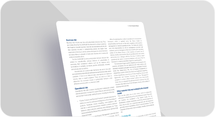 C _ Group Management Report Allianz has developed a consistent operational risk management Business risks include cost risks and policyholder behavior risks. They framework, which is applied across the Group based on are mostly driven by the Life/Health business and to a lesser extent by proportionality and focuses on the early recognition and proactive the Property-Casualty business. Cost risks are associated with the risk management of material operational risks. The framework defines that expenses incurred in administering policies are higher than roles and responsibilities as well as management processes and expected or that new business volume decreases to a level that does methods: Local risk managers at Allianz SE and at the other operating not allow Allianz to absorb its fixed costs. Business risk is measured entities of the Allianz Group, in their capacity as Second Line of relative to baseline plans. Defense, identify and evaluate relevant operational risks and control For the Life/Health business, policyholder behavior risks are risks deficiencies via a dialogue with the First Line of Defense, report related to unpredictable, adverse behavior of policyholders in operational risk events in a central database, and ensure that the exercising their contractual options, such as, for instance, early framework is implemented in their respective operating entity. termination of contracts, surrenders, partial withdrawals, renewals, This framework triggers specific mitigating control programs. For and annuity take-up options. example, compliance risks are addressed with written policies and Assumptions on policyholder behavior are set in line with dedicated compliance programs monitored by compliance functions accepted actuarial methods and based on own historical data, where across the Allianz Group. The risk of financial misstatement is available. If there is no historical data, assumptions are based on mitigated by a system of internal controls covering financial reporting. industry data or expert judgment. These are used as a basis to Outsourcing risks are covered by our Outsourcing Policy, Service Level determine the economic impact of policyholder behavior under Agreements, and Business Continuity and Crisis Management different scenarios within our internal model. programs to protect critical business functions from these events. Cyber risks are mitigated through investments in cybersecurity, cyber insurance that Allianz buys from third-party insurers, and a variety of Operational risks refer to losses resulting from inadequate or failed ongoing control activities. internal processes, human errors, system failures, and external events, and can stem from a wide variety of sources, including the following: − “Clients, Products and Business Practices”: potential losses due to There are risks which, due to their nature, cannot be adequately a failure to meet the professional obligations or from the design of addressed or mitigated by setting aside dedicated capital. These risks products. Examples include misselling, non-compliance with are therefore not considered in the internal model. For the internal or external requirements related to products, anti-trust identification, analysis, assessment, monitoring, and management of behavior, data protection, sanctions and embargoes, etc. These these risks we also use a systematic approach, with risk assessment losses tend to be less frequent but, when they occur, can have high generally based on qualitative criteria or scenario analyses. The most financial impact. important of these other risks are strategic, liquidity, and reputational − “Execution, Delivery, and Process Management”: potential losses risk. arising from transaction or process management failures. Examples include interest and penalties from non-payment or Strategic risk underpayment of taxes or losses associated with broker and agent Strategic risk is the risk of a decrease in the company’s value that will distribution processes. These losses tend to be of a relatively higher arise from adverse management decisions on business strategies and frequency but with little financial impact (although single large- their implementation. loss events can occur). Strategic risks are identified and evaluated as part of the Group’s − Other operational risks including, for example, internal or external Top Risk Assessment process, and discussed in various Board of fraud, financial misstatement risk, a cybersecurity incident causing Management-level committees (for example, GFRC). We also monitor business disruption or fines, a potential failure at our outsourcing market and competitive conditions, capital market requirements, partners causing a disruption to our working environment, etc. regulatory conditions, etc., to decide if strategic adjustments are necessary. The Group’s operational risk capital is dominated (by more than 80 %) The most important strategic risks are directly addressed through by the risk of potential losses within the categories “Clients, Products, Allianz’s Renewal Agenda, which focuses on five themes: True and Business Practices” and “Execution, Delivery, and Process Customer Centricity, Digital by Default, Technical Excellence, Growth Management”. With regard to the largest category “Clients, Products, Engines, and Inclusive Meritocracy. Progress on mitigating strategic and Business Practices”, key external drivers are changes in laws and risks and meeting the Renewal Agenda objectives is monitored and regulations. Internal drivers reflect potential failures of internal evaluated in the course of the Strategic and Planning Dialogues processes. These drivers are considered in the local scenario analyses. between the Allianz Group and the related undertakings. Operational risk capital is calculated using a scenario-based approach based on expert judgment as well as internal and external operational loss data. The estimates for fr