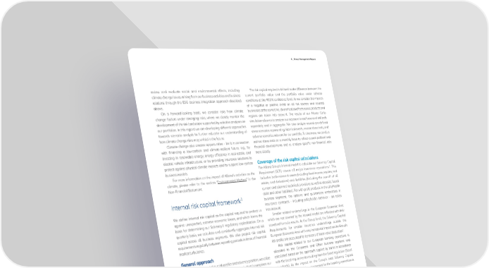 C _ Group Management Report review and evaluate social and environmental effects, including The risk capital required is defined as the difference between the climate change issues, arising from our business activities and business current portfolio value and the portfolio value under adverse relations through the ESG business integration approach described conditions at the 99.5 % confidence level. As we consider the impacts above. of a negative or positive event on all risk sources and covered On a forward-looking basis, we consider risks from climate businesses at the same time, diversification effects across products and change factors under emerging risks, where we closely monitor the regions are taken into account. The results of our Monte Carlo development of the risk landscape supported by selective analyses on simulation allow us to analyze our exposure to each source of risk both our portfolios. In this regard we are developing different approaches separately and in aggregate. We also analyze several pre-defined towards scenario analysis to further educate our understanding of stress scenarios representing historical events, reverse stress tests, and how climate change risks may unfold in the future. adverse scenarios relevant for our portfolio. Furthermore, we conduct Climate change also creates opportunities – be it in connection ad-hoc stress tests on a monthly basis to reflect current political and with financing a low-carbon and climate-resilient future, e.g., by financial developments and to analyze specific non-financial risks investing in renewable energy, energy efficiency in real estate, and more closely. electric vehicle infrastructure, or by providing insurance solutions to protect against physical climate impacts and to support low-carbon Coverage of the risk capital calculations business models. The Allianz Group’s internal model to calculate our Solvency Capital For more information on the impact of Allianz’s activities on the Requirement (SCR) covers all major insurance operations2. This climate, please refer to the section “Environmental Matters” in the includes both relevant assets (including fixed-income, equities, real Non-Financial Statement. estate, and derivatives) and liabilities (including the run-off of all current and planned technical provisions as well as deposits, issued 1 debt and other liabilities). For with-profit products in the Life/Health Internal risk capital framework business segment, the options and guarantees embedded in insurance contracts – including policyholder behavior – are taken We define internal risk capital as the capital required to protect us into account. against unexpected, extreme economic losses, and which forms the Smaller related undertakings in the European Economic Area basis for determining our Solvency II regulatory capitalization. On a which are not covered by the internal model are reflected with their quarterly basis, we calculate and consistently aggregate internal risk standard formula results. At the Group level, the Solvency Capital capital across all business segments. We also project risk capital Requirements for smaller insurance undertakings outside the requirements regularly between reporting periods in times of financial European Economic Area with only immaterial impact on the Group’s market turbulence. risk profile are accounted for by means of book value deduction3 . Risk capital related to our European banking operations is allocated to the Corporate and Other business segment and For the management of our risk profile and solvency position, we utilize calculated based on the approach applied by banks in accordance an approach that reflects the Solvency II rules in that it comprises our with the local requirements resulting from the Basel regulation (Basel approved internal model covering all major insurance operations. standards). As the impact on the Group’s total Solvency Capital Other entities are reflected based on standard formula results, others Requirement is minor, risk management for the banking operations is under the deduction and aggregation approach as well as on sectoral not discussed in greater detail. or local requirements for non-insurance operations, in accordance with For our Asset Management business segment, we assign internal the Solvency II framework. risk capital requirements based on sectoral regulatory capital requirements. The Asset Management business is affected mainly by Internal model operational risks. However, since most of our Asset Management Our internal model is based on a VaR approach using a Monte Carlo business is not located in the eurozone, at Group level its participation simulation. Following this approach, we determine the maximum loss value bears a foreign exchange rate risk. Our Asset Management in portfolio value in scope of the model within a specified timeframe operations are covered by local risk functions which are running risk- (“holding period”, set at one year) and probability of occurrence controlling processes, including qualitative risk assessments, set up by (“confidence level”, set at 99.5 %). We simulate risk events from all risk the respective entities. In addition, Allianz Asset Management GmbH categories (“sources of risk”) modeled, and calculate the portfolio provides oversight over the local activities through its control functions value based on the net fair value of assets minus liabilities, including and ensures that the reporting and assurance requirements as defined risk-mitigating measures such as reinsurance contracts or derivatives, by Allianz Group are met. Due to the particular importance of under each scenario. operational risks for the Asset Management business, a key task for the local risk management functions in the related entities is a regular monitoring of the internal controls attached to material processes, which is part of the Integrated Risk and Control System. Additional examples f