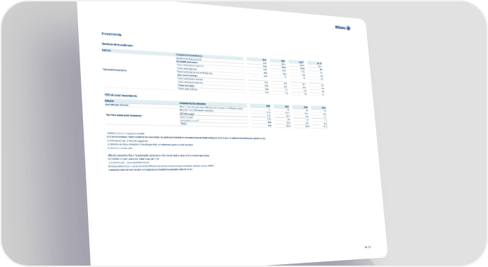 Investments Sustainable Investments Indicator Components/Sub-Indicators Unit 2021 2020 3 2019 4 Global Portfolio ESG screened5 € bn 849.2 835.0 795.0 Sustainable investments € bn 123.1 127.0 n/a Thereof environmental objectives € bn 109.9 115.6 n/a Thereof social objectives € bn 12.0 10.8 n/a Sustainable Investments Thereof environmental and social objectives € bn 1.1 0.5 n/a Asset class breakdown Thereof sustainable sovereigns € bn 84.1 92.7 n/a Thereof sustainable corporates € bn 25.5 21.9 n/a Thereof renewables € bn 7.0 6.9 n/a Thereof green buildings € bn 6.4 5.6 n/a ESG-themed Investments Indicator Components/Sub-Indicators Unit 2021 2020 2019 Asset Manager Selection Share of asset managers being PRI signatories or having an ESG policy in place % 99 99 99 AllianzGI - Total ESG-themed Investments € bn 184.3 95.4 56.1 ESG risk focused6 € bn 43.1 51.0 31.0 Third Party Assets under Management Impact focused7 € bn 4.8 2.2 1.8 Sustainability focused8 € bn 136.4 42.1 23.3 PIMCO € bn 203.1 136.5 101.6 1) Multiple topics per engagement possible. 2) Given the extensive Freeze of positions that could breach new ambitious thresholds for coal based business models coming into effect in 2023, no additional divestments are reported for 2021. 3) KPIs were not part of the audit engagement. 4) Definition was newly introduced in financial year 2021, no comparison figures for 2019 disclosed. 5) Based on economic view. AllianzGI changed the titles of its sustainability categories to reflect the developing nature of its investment approaches. 6) ESG Risk focused – previously labeled Integrated ESG. 7) Impact focused – previously labeled Impact. 8) Sustainability focused – previously labeled SRI and now includes newly developed sustainable strategies such as CEWO. It should be noted that only the latter two categories are considered Sustainable under the SFDR. 16 / 21