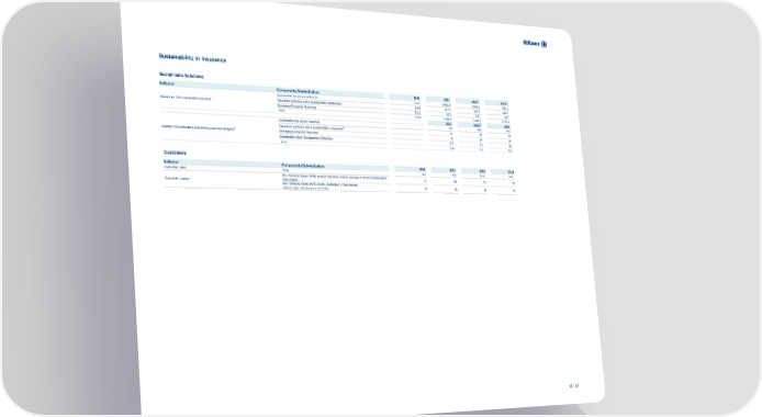 Sustainability in Insurance Sustainable Solutions Indicator Components/Sub-Indicators Unit 2021 2020 2 2019 2 Sustainable Insurance Solutions € mn 1,022.0 1,025.2 965.3 Revenues from sustainable solutions1 Insurance solutions with a sustainability component € mn 417.6 367.6 366.7 Emerging Consumer Solutions € mn 45.2 56.1 40.7 Total € mn 1,484.7 1,448.9 1,372.7 2021 2020 2 2019 Sustainable Insurance Solutions 91 105 109 Insurance solutions with a sustainability component4 41 39 39 Number of sustainable solutions by solution category3 Emerging Consumer Solutions 30 26 28 Sustainable Asset Management Solutions 177 61 52 Total 339 231 228 Customers Indicator Components/Sub-Indicators Unit 2021 2020 2019 Customer Base Total mn 126 100+ 100+ Net Promoter Score (NPS) greater than local market average or loyalty leadership in % 84 79 70 Customer Loyalty their market Net Promoter Score (NPS) loyalty leadership in their market % 58 60 46 Board target 50% by year-end 2024 13 / 21
