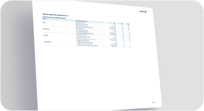 Climate-related financial disclosure Regional listed equity portfolio indicators Indicator Components/Sub-Indicators Unit 2021 2020 Europe Region total AuM € bn 20.1 15.6 Europe Europe Region Absolute emissions mn t CO₂e 1.4 1.2 Europe Region Relative emissions t CO₂e/€ mn invested 34.4 36.9 Europe Region weighted average carbon intensity t CO₂e/€ mn sales 62.7 69.4 North America total AuM € bn 9.5 7.5 North America North America Absolute emissions mn t CO₂e 0.3 0.3 North America Relative emissions t CO₂e/€ mn invested 6.6 8.4 North America weighted average carbon intensity t CO₂e/€ mn sales 35.8 26.4 Asia/Pacific Region total AuM € bn 6.5 5.6 Asia/Pacific Asia/Pacific Region Absolute emissions mn t CO₂e 0.3 0.4 Asia/Pacific Region Relative emissions t CO₂e/€ mn invested 6.7 11.1 Asia/Pacific Region weighted average carbon intensity t CO₂e/€ mn sales 16.4 25.2 Emerging Markets Region total AuM € bn 4.7 3.7 Emerging Markets Emerging Markets Region Absolute emissions mn t CO₂e 0.3 0.4 Emerging Markets Region Relative emissions t CO₂e/€ mn invested 8.0 11.1 Emerging Markets Region weighted average carbon intensity t CO₂e/€ mn sales 19.1 22.7 18 / 21