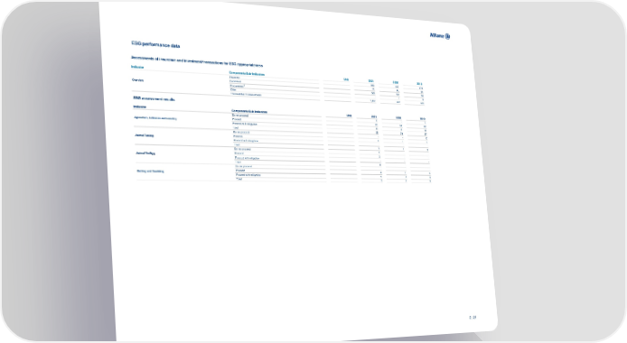 ESG performance data Assessments of insurance and investment transactions for ESG appropriateness Indicator Components/Sub-Indicators Unit 2021 2020 2019 Insurance 850 430 474 Investment 71 65 64 Overview Procurement1 526 101 58 Other - 1 6 Total number of assessments 1,447 597 602 ESG assessment results Indicator Components/Sub-Indicators Unit 2021 2020 2019 Do not proceed 1 - 1 Agriculture, Fisheries and Forestry Proceed 23 24 22 Proceed with mitigation 11 15 14 Total 35 39 37 Do not proceed - - 2 Animal Testing Proceed 1 1 1 Proceed with mitigation - - - Total 1 1 3 Do not proceed 1 - - Animal Welfare Proceed 3 - - Proceed with mitigation - - - Total 4 - - Do not proceed - - - Betting and Gambling Proceed 4 2 3 Proceed with mitigation 1 1 3 Total 5 3 6 2 / 21