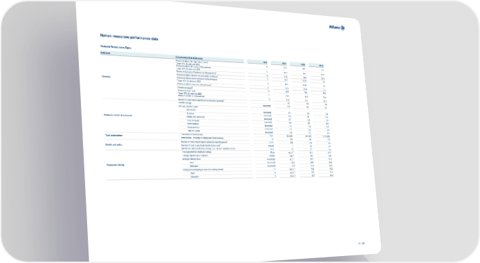 Human resources performance data Human Resources Data Indicator Components/Sub-Indicators Unit 2021 2020 2019 Women in Allianz SE Supervisory Board5 % 33.3 33.3 n/a Target 30% by year-end 2021 Women in Allianz SE Board of Management % 20.0 20.0 20.0 Target 30% by year-end 2021 6 % Women in Executive Positions (Top Management) 31.6 30.4 29.9 7 % Women in Allianz Global Executive (AGE) Positions 24.5 20.30 n/a 7 Diversity Women in Allianz Senior Executive (ASE) Positions % 24.7 25.80 n/a Target 30% by year-end 2021 7 % Women in Allianz Executive (AE) Positions 32.8 32.00 n/a 8 % Female managers 38.6 38.2 37.9 Women in talent pools % 43.4 42.3 40.2 Target 40% by year-end 2021 Share of women in core business % 51.6 51.3 51.3 9 Number of nationalities represented in executive positions 67 59 64 Overall average days/empl 6.9 6.9 8.1 Average days by region Asia Pacific days/empl 3.0 3.0 3.9 Germany days/empl 9.4 9.6 11.5 Sickness-related absenteeism Middle East and Africa days/empl 2.7 2.5 3.6 Eastern Europe days/empl 5.5 5.8 6.8 North America days/empl 1.3 1.3 2.0 South America days/empl 1.7 2.2 3.0 Rest of Europe days/empl 8.2 7.8 8.6 Total absenteeism Total absenteeism lost days days 993,348 981,093 1,110,896 Absenteeism - coverage of employees (core business) % 100 100 100 Number of work related injuries during the reporting period7 cases 578 n/a n/a Health and safety Number of fatal occupational injuries during work7 persons 1 n/a n/a Numbers of hours worked on average of a full-time equivalent (core) hours 7.7 7.7 n/a Total expenses for employee training 10 € mn 102.9 63.1 84.7 Training expenses per employee 10 €/empl 716 442 613 Average training hours hours/empl 11 20.7 24.0 34.7 Employee training Staff hours/empl 33.3 20.5 24.8 Managers hours/empl 43.5 21.6 26.6 Employees undergoing at least one training session % 12 78.8 75.2 103.1 Staff % 12 78.0 73.5 102.9 Managers % 12 83.7 84.8 104.5 11 / 21