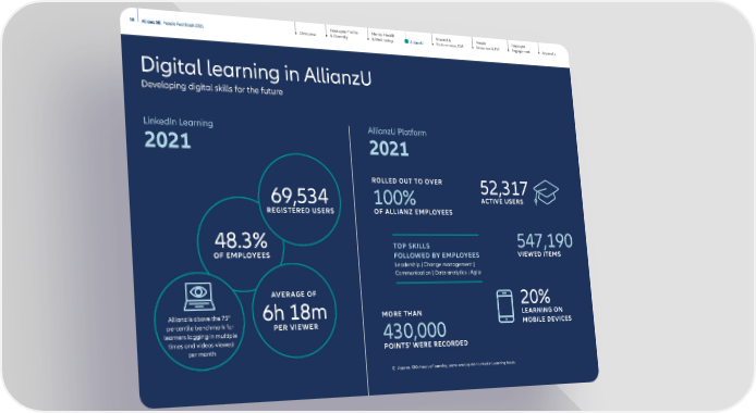 Employee Profile & Diversity Mental Health & Well-being Reward & Performance, GM Employee Engagement Appendix People Attraction & TM 30 Allianz SE People Fact Book 2021 Overview AllianzU Digital learning in AllianzU Developing digital skills for the future LinkedIn Learning 2021 AllianzU Platform 2021 48.3% OF EMPLOYEES 69,534 REGISTERED USERS AVERAGE OF 6h 18m PER VIEWER Allianz is above the 75 th percentile benchmark for learners logging in multiple times and videos viewed per month 52,317 ACTIVE USERS 547,190 VIEWED ITEMS ROLLED OUT TO OVER 100% OF ALLIANZ EMPLOYEES MORE THAN 430,000 POINTS 1 WERE RECORDED 1) Approx. 430k hours of learning, some overlap with LinkedIn Learning hours. TOP SKILLS FOLLOWED BY EMPLOYEES Leadership | Change management | Communication | Data analytics | Agile 20% LEARNING ON MOBILE DEVICES