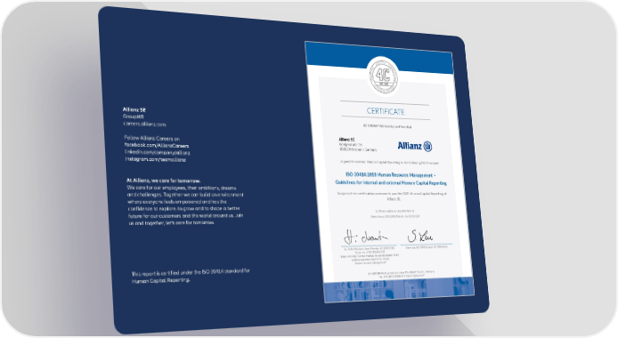 Allianz SE GroupHR careers.allianz.com Follow Allianz Careers on facebook.com/AllianzCareers linkedin.com/company/allianz instagram.com/teamallianz At Allianz, we care for tomorrow. We care for our employees, their ambitions, dreams and challenges. Together we can build an environment where everyone feels empowered and has the confidence to explore, to grow and to shape a better future for our customers and the world around us. Join us and together, let’s care for tomorrow. This report is certified under the ISO 30414 standard for Human Capital Reporting. 4C GROUP AG hereby certifies that aligned its external Human Capital Reporting to the following ISO Standard: ISO 30414:2018 Human Resource Management – Guidelines for internal and external Human Capital Reporting Subject of the certification assessment was the 2021 Human Capital Reporting of Allianz SE. Certificate register no.: ALL0003-003-01 Date of issue: 23.03.2022 Munich, the 23.03.2022 CERTIFICATE 4C GROUP AG, Elsenheimerstrasse 55a, 80687 Munich, Germany Tel.: +49 (89) 599882-0 | www.4cgroup.com Allianz SE Königinstraße 28 80802 München / Germany Sarah Leu, ISO 30414 Expert, 4C GROUP AG Dr. Heiko Mauterer, Board Member, 4C GROUP AG Co-author of ISO 30414:2018 Expert with the “German institute for standardization (DIN) working committee NA 159-01-19 AA Human Resource Management“