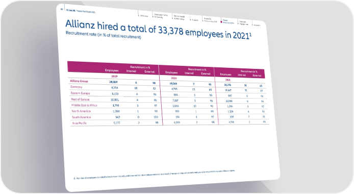 Employee Profile & Diversity Mental Health & Well-being AllianzU Reward & Performance, GM Employee Engagement Appendix 41 Allianz SE People Fact Book 2021 Overview People Attraction & TM Allianz hired a total of 33,378 employees in 2021 1 Recruitment rate (in % of total recruitment) Recruitment in % Recruitment in % Recruitment in % Employees Internal External Employees Internal External Employees Internal External 2019 2020 2021 Allianz Group 24,829 6 94 19, 56 4 7 93 33,378 35 65 Germany 4,254 18 82 4,795 15 85 14,667 73 27 Eastern Europe 1,153 4 96 884 5 95 887 6 94 Rest of Europe 10,801 4 96 7, 2 67 5 95 10,080 6 94 Middle East & Africa 1,798 3 97 1,066 10 90 1,384 3 97 North America 1,284 1 99 959 1 99 1,320 4 96 South America 362 0 100 194 3 97 309 7 93 Asia Pacific 5,177 2 98 4,399 2 98 4,731 2 98 1) Number of employees recruited refers to new hires only and does not include employees taken on as a result of mergers or acquisitions and employees who moved within the same Allianz company.