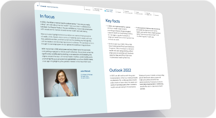 Employee Profile & Diversity AllianzU Reward & Performance, GM Employee Engagement Appendix People Attraction & TM 22 Allianz SE People Fact Book 2021 Overview Mental Health & Well-being Outlook 2022 Key facts In focus In 2022, we will continue with the global implementation of the four minimum health requirements. By running quarterly health pulse checks to learn about the needs and wants of our employees when it comes to health and well-being in the workplace. Subsequently, we will develop corresponding global initiatives to address gaps and major pain points and define new global standards, if necessary, to ensure sustainable implementation. Additionally, we will offer best-in-class mental health services. • In 2021, we implemented four global minimum health requirements: providing professional psychological support, health and well-being training for managers, regular feedback on employee health and a meeting free time to focus on work. • By the beginning of 2022, 95% of OEs have implemented Employee Assistance Programs, 72% of managers underwent health and well-being training, 64% of employees are satisfied with feedback opportunities and 67% of OEs have implemented meeting free time. • Multiple global initiatives raise awareness and break the stigma around mental health, such as the Mental Health podcast series “How are you really doing?” and the Well Together health app. In 2021, the Allianz mental health podcast series “How are you really doing? Let’s talk about mental health!” was launched in collaboration between the People Product House and AllianzU. It provides employees with valuable information around mental health and well-being. Nine episodes highlighted stories and lessons learned from people in all walks of life. Guests share stories of hardship and triumph, self-care tips, guided exercises, and best practices for creating psychologically safe workplace and developing personal resilience. The podcast series is brought to our employees via our global AllianzU learning platform. With more than 1,500 employees actively listening to the podcasts and getting engaged to initiate a self-reflection, the podcast series has significantly contributed to starting a conversation and breaking the stigma around the topic of mental health. Further, social media posts, promoting the podcast externally generated more than 28,000 views, once again highlighting the general interest in this important topic. Julie Mitchell Chief General Manager, Personal Injury, Allianz Australia
