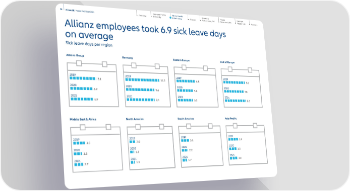 Employee Profile & Diversity AllianzU Reward & Performance, GM Employee Engagement Appendix People Attraction & TM 26 Allianz SE People Fact Book 2021 Overview Mental Health & Well-being Allianz employees took 6.9 sick leave days on average Sick leave days per region Allianz Group Germany Eastern Europe Rest of Europe North America South America Asia Pacific Middle East & Africa 2021 2021 2021 2021 2021 2021 2021 2021 2020 2020 2020 2020 2019 2019 2019 2019 2020 2020 2020 2020 2019 2019 2019 2019 7. 8 5.8 5.5 2.5 2.7 2.2 1.7 1.3 1.3 9.6 9.4 6.9 6.9 3.0 3.0 8.1 11.5 6.8 8.6 8.2 3.6 2.0 3.0 3.9