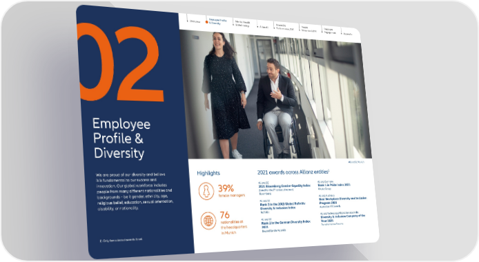 Mental Health & Well-being AllianzU Reward & Performance, GM Employee Engagement Appendix People Attraction & TM 10 Allianz SE People Fact Book 2021 Overview Employee Profile & Diversity We are proud of our diversity and believe it is fundamental to our success and innovation. Our global workforce includes people from many different nationalities and backgrounds – be it gender, ethnicity, age, religious belief, education, sexual orientation, disability, or nationality. Allianz SE 2021 Bloomberg Gender-Equality Index (listed for the 6 th consecutive year) Bloomberg Allianz SE Rank 5 in the 2021 Global Refinitiv Diversity & Inclusion Index Refinitiv Allianz SE Rank 2 in the German Diversity Index 2021 BeyondGenderAgenda Allianz Germany Rank 1 in Pride Index 2021 Uhlala Group Allianz Australia Best Workplace Diversity and Inclusion Program 2021 Australian HR Awards Allianz Technology/Allianz Services India Diversity & Inclusion Company of the Ye a r 2 0 21 Transformance Forums Highlights 2021 awards across Allianz entities 1 02 76 nationalities at the headquarters in Munich 1) Only few selected awards listed. AllianzGI, Munich Employee Profile & Diversity 39% female managers