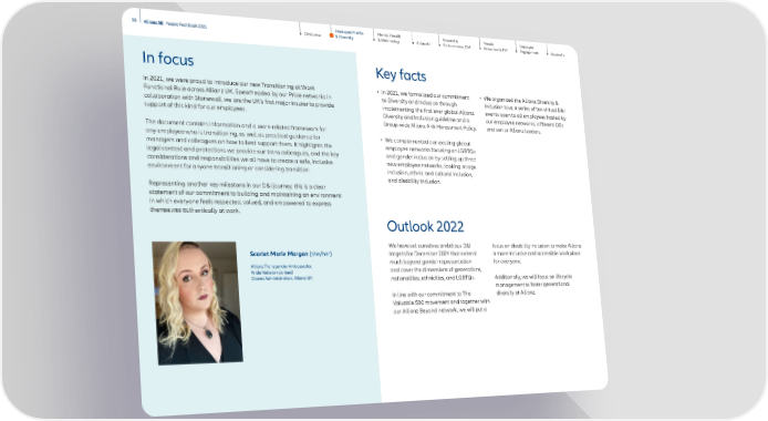 Mental Health & Well-being AllianzU Reward & Performance, GM Employee Engagement Appendix People Attraction & TM 11 Allianz SE People Fact Book 2021 Overview Employee Profile & Diversity Outlook 2022 Key facts In focus We have set ourselves ambitious D&I targets for December 2024 that extend much beyond gender representation and cover the dimensions of generations, nationalities, ethnicities, and LGBTQ+. In line with our commitment to The Valuable 500 movement and together with our Allianz Beyond network, we will put a • In 2021, we formalized our commitment to Diversity and Inclusion through implementing the first ever global Allianz Diversity and Inclusion guideline and a Group-wide Allianz Anti-Harassment Policy. • We complemented our existing global employee networks focusing on LGBTQ+ and gender inclusion by setting up three new employee networks, looking at age inclusion, ethnic and cultural inclusion, and disability inclusion. In 2021, we were proud to introduce our new Transitioning at Work Functional Rule across Allianz UK. Spearheaded by our Pride networks in collaboration with Stonewall, we are the UK’s first major insurer to provide support of this kind for our employees. The document contains information and a work-related framework for any employee who is transitioning, as well as practical guidance for managers and colleagues on how to best support them. It highlights the legal context and protections we provide our trans colleagues, and the key considerations and responsibilities we all have to create a safe, inclusive environment for anyone transitioning or considering transition. Representing another key milestone in our D&I journey, this is a clear statement of our commitment to building and maintaining an environment in which everyone feels respected, valued, and empowered to express themselves authentically at work. Scarlet Marie Morgan (she/her) Allianz Transgender Ambassador, Pride Network co-lead Claims Administration, Allianz UK focus on disability inclusion to make Allianz a more inclusive and accessible workplace for everyone. Additionally, we will focus on lifecycle management to foster generational diversity at Allianz. • We organized the Allianz Diversity & Inclusion tour, a series of ten virtual D&I events open to all employees hosted by our employee networks, different OEs and senior Allianz leaders.