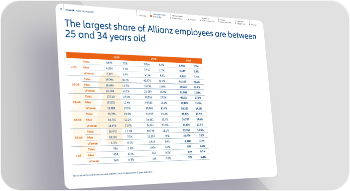 Mental Health & Well-being AllianzU Reward & Performance, GM Employee Engagement Appendix People Attraction & TM 17 Allianz SE People Fact Book 2021 Overview Employee Profile & Diversity The largest share of Allianz employees are between 25 and 34 years old 2019 2020 2021 < 25 Total 9,675 7. 0 % 9,0 6 6 6.3% 8,481 5.9% Men 4,284 3.1% 3,910 2.7% 3,649 2.5% Women 5,391 3.9% 5,156 3.6% 4,832 3.4% 25-34 Total 39,096 28.2% 41, 379 28.8% 41,105 28.6% Men 18,696 13.5% 19,79 0 13.8% 19, 524 13.6% Women 20,400 14.7% 21,589 15.0% 21,581 15.0% 35-44 Total 3 7, 51 8 2 7. 0 % 39, 551 27.5% 40,011 2 7.9 % Men 18,530 13.4% 19,583 13.6% 19,829 13.8% Women 18,988 13.7% 19,968 13.9% 20,182 14.1% 45-54 Total 33, 376 23.9% 33,907 23.6% 33,821 23.5% Men 16,731 12.0% 16,861 11.7% 16,707 11.6% Women 16,645 11.9% 1 7, 0 4 6 11.9% 1 7, 11 4 11.9% 55-64 Total 18,472 13.3% 18,796 13.1% 19, 352 13.5% Men 10,101 7. 3 % 10,259 7. 1 % 10,470 7. 3 % Women 8,371 6.0% 8,537 5.9% 8,882 6.2% ≥ 65 Total 796 0.6% 1,006 0.7% 850 0.6% Men 428 0.3% 661 0.5% 479 0.3% Women 368 0.3% 345 0.2% 371 0.3% Age structure figures based on salaried workforce. No child labor (below 15 years old) exists.