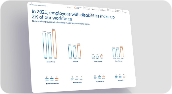 Mental Health & Well-being AllianzU Reward & Performance, GM Employee Engagement Appendix People Attraction & TM 19 Allianz SE People Fact Book 2021 Overview Employee Profile & Diversity In 2021, employees with disabilities make up 2% of our workforce Number of employees with disabilities in Allianz companies by region Allianz Group Middle East & Africa Germany Eastern Europe 2,818 2,893 63 57 1,320 1,427 192 190 56 44 Asia Pacific 2020 2019 2021 2020 2019 2021 2020 2019 2021 2020 2019 2021 2020 2019 2021 3,222 54 1,502 210 North America South America 12 12 92 22 2020 2019 2021 2020 2019 2021 5 71 Rest of Europe 1,083 1,141 2020 2019 2021 1, 313 67