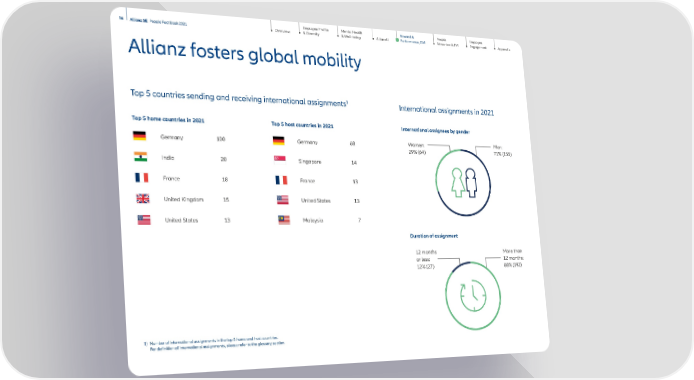 Employee Profile & Diversity Mental Health & Well-being AllianzU Employee Engagement Appendix People Attraction & TM 36 Allianz SE People Fact Book 2021 Overview Reward & Performance, GM Allianz fosters global mobility Top 5 home countries in 2021 Germany 100 India 20 France 18 United Kingdom 15 United States 13 Top 5 host countries in 2021 Germany 68 Singapore 14 France 13 United States 13 Malaysia 7 Top 5 countries sending and receiving international assignments 1 International assignments in 2021 Duration of assignment Women: 29% (6 4) Men: 71% (155) International assignees by gender 12 months or less: 12% (27) More than 12 months: 88% (192) 1) Number of international assignments in the top 5 home and host countries. For definition of international assignments, please refer to the glossary section.