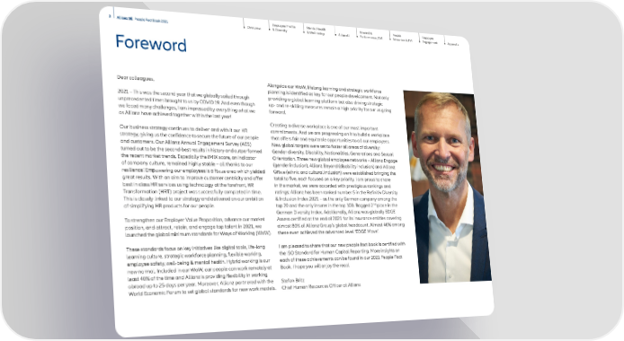 Employee Profile & Diversity Mental Health & Well-being AllianzU Reward & Performance, GM Employee Engagement Appendix People Attraction & TM 2 Allianz SE People Fact Book 2021 Overview Dear colleagues, 2021 – This was the second year that we globally sailed through unprecedented times brought to us by COVID 19. And even though we faced many challenges, I am impressed by everything what we as Allianz have achieved together within the last year! Our business strategy continues to deliver and with it our HR strategy, giving us the confidence to secure the future of our people and customers. Our Allianz Annual Engagement Survey (AES) turned out to be the second-best results in history and outperformed the recent market trends. Especially the IMIX score, an indicator of company culture, remained highly stable – all thanks to our resilience! Empowering our employees is a focus area which yielded great results. With an aim to improve customer centricity and offer best in class HR services using technology at the forefront, HR Transformation (HRT) project was successfully completed in time. This is closely linked to our strategy and delivered on our ambition of simplifying HR products for our people. To strengthen our Employer Value Proposition, advance our market position, and attract, retain, and engage top talent in 2021, we launched the global minimum standards for Ways of Working (WoW). These standards focus on key initiatives like digital tools, life-long learning culture, strategic workforce planning, flexible working, employee safety, well-being & mental health. Hybrid working is our new normal. Included in our WoW, our people can work remotely at least 40% of the time and Allianz is providing flexibility in working abroad up to 25 days per year. Moreover, Allianz partnered with the World Economic Forum to set global standards for new work models. Alongside our WoW, lifelong learning and strategic workforce planning is identified as key for our people development. Not only providing a global learning platform but also driving strategic up- and re-skilling measures remain a high priority for our us going forward. Creating a diverse workplace is one of our most important commitments. And we are progressing on it to build a workplace that offers fair and equitable opportunities to all our employees. New global targets were set to foster all areas of diversity: Gender diversity, Disability, Nationalities, Generations and Sexual Orientation. Three new global employee networks – Allianz Engage (gender inclusion), Allianz Beyond (disability inclusion) and Allianz Grace (ethnic and cultural inclusion) were established bringing the total to five, each focused on a key priority. I am proud to share in the market, we were accorded with prestigious rankings and ratings: Allianz has been ranked number 5 in the Refinitiv Diversity & Inclusion Index 2021 – as the only German company among the top 20 and the only insurer in the top 100. Bagged 2 nd place in the German Diversity Index. Additionally, Allianz was globally EDGE Assess certified at the end of 2021 for its insurance entities covering almost 80% of Allianz Group’s global headcount. Almost 40% among these even achieved the advanced level ‘EDGE Move’. I am pleased to share that our new people fact book is certified with the ISO Standard for Human Capital Reporting. More insights on each of these achievements can be found in our 2021 People Fact Book. I hope you will enjoy the read. Stefan Britz Chief Human Resources Officer at Allianz Foreword